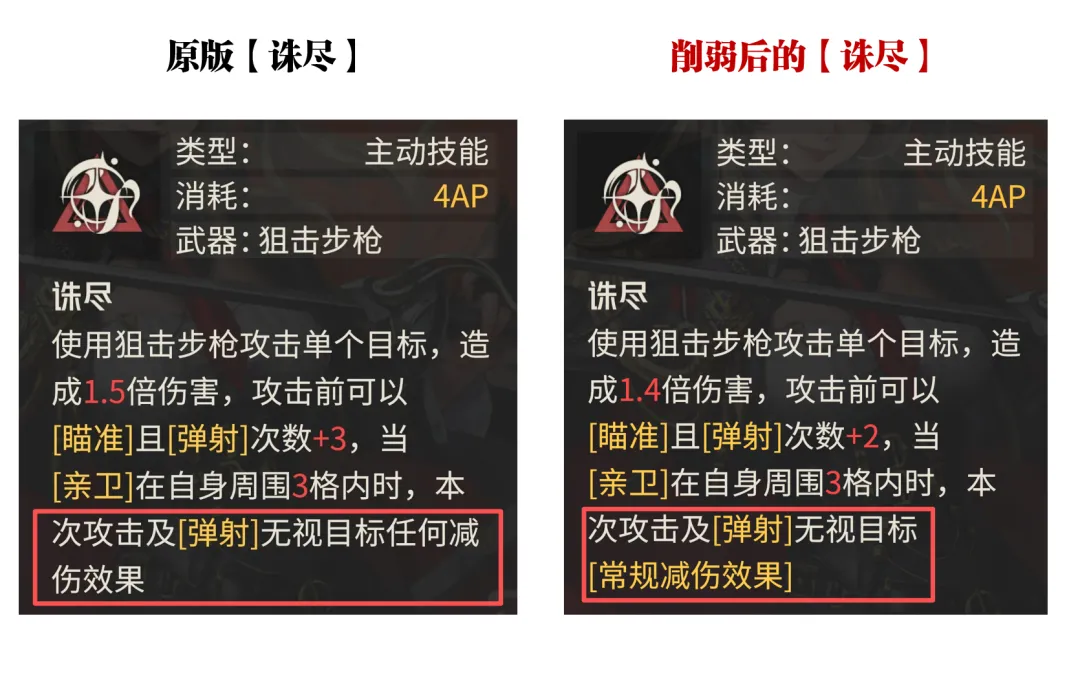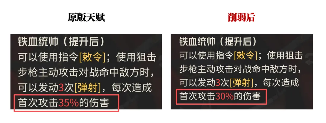 接着第二个削弱操作则是针对再动技能“献势”的调整,此技能在基础效果上没啥改变,但亲卫在重启奥德莉之后,其会给奥德莉施加的“交辉·猎袭”buff则出现了削弱调整,主要是将20%的暴击伤害提升给削减为了10%,这点考虑到奥德莉本身就不低的暴击预期,同时外加我们人工干预提升的暴击属性,整个奥德莉的暴击属性削减10%其实也就意味着其总伤害大致也有小10%的降低,这点也是值得大家关注的一个核心要素。