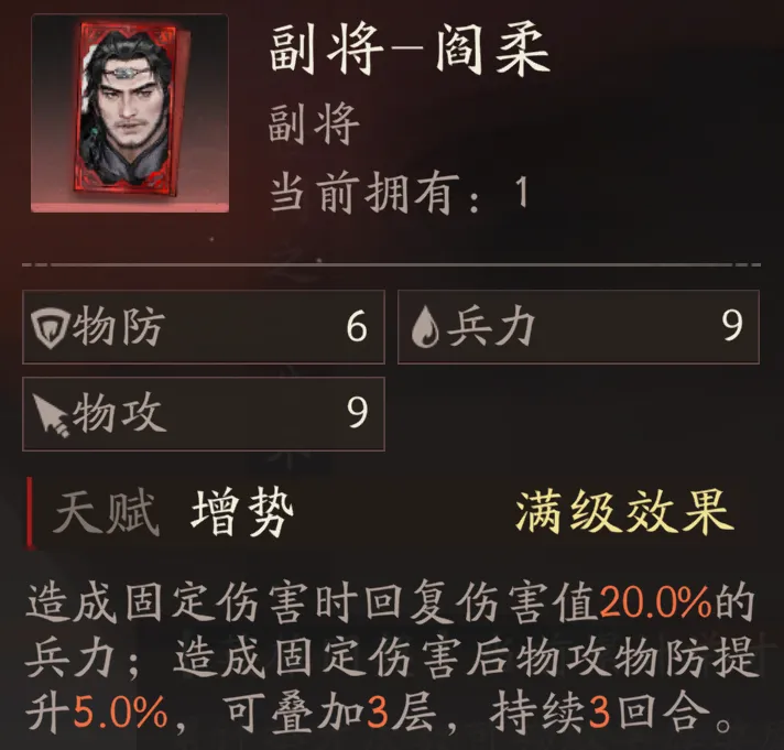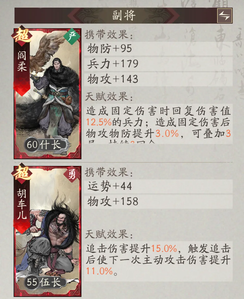 最后则是副将选择,目前维一的搭配是“阎柔”+“胡车儿”,其余例如夏侯昭、韩浩,包括黄色副将车胄、邢道荣等也可以纳入过渡的考虑范畴。