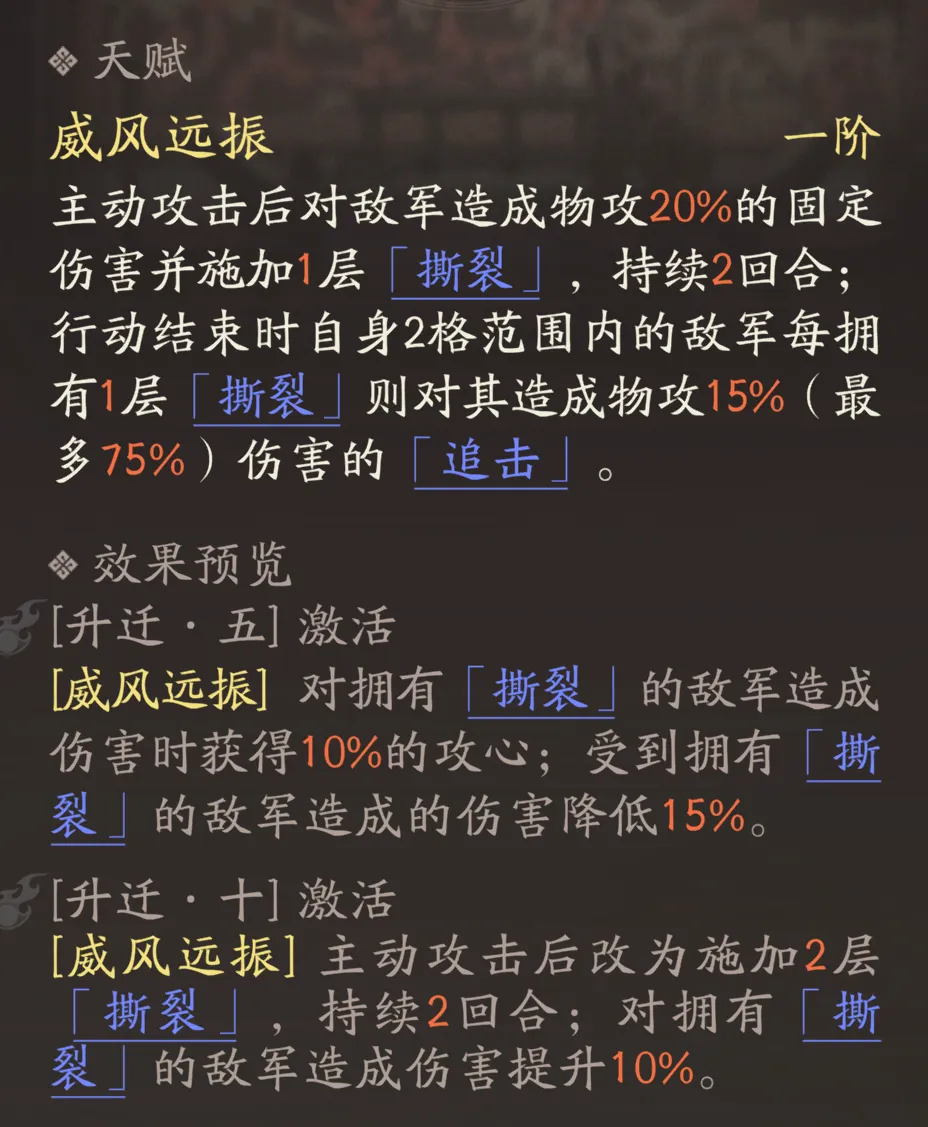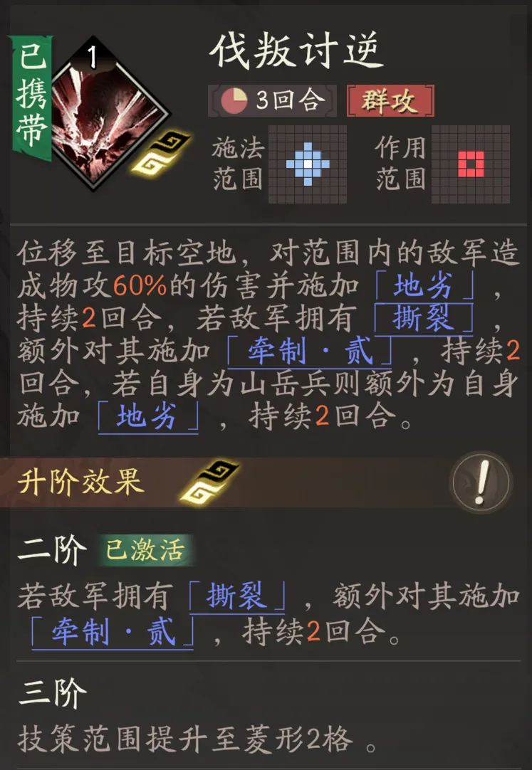 然后位移+范围输出的【伐叛讨逆】技能也对牵招挺有价值,因为范围输出就可以群体施加“撕裂”,同时这个技能在升到2阶后会额外给“撕裂”敌人施加“-2移动力”的效果,那由于牵招自身“撕裂”施加的判定就在“牵制”效果之前,因此不管敌人是否已经被提前施加了“撕裂”,我们直接用牵招都可以群体触发“撕裂”和“-2移动力”的效果。