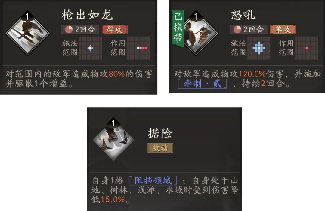 最后牵招还能带一个普通技能,我们则需要视情况来选择,例如需要群体输出就带【枪出如龙】,而有如果战斗场景中以山林等地形为主,则可以考虑“据险”等等,反正这3个技能各有特色,大家按需考量即可。