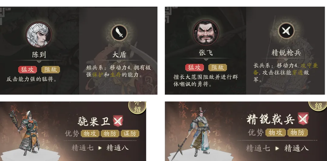 然后牵招的兵种嘛......维一个人用的更多的还是长兵虎王,因为这个职业的攻击范围是在是有点那个......而短兵的那个攻击范围则着实有点让人汗颜,虽然有技能【伐叛讨逆】的对应找补,但维一个人还是更喜欢长兵虎王,当然在一些特殊的关卡中,短兵或许也会有更好的价值,所以理论上......牵招也是需要开双线才能最大化其价值的。