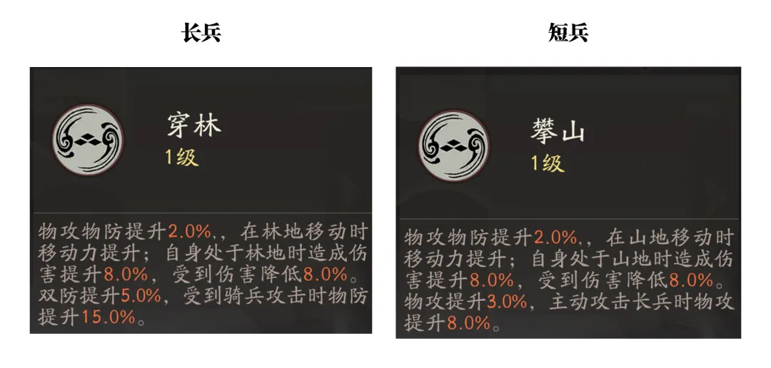 此外这个技能会更加适合于短兵的牵招,因为短兵牵招还能给自身施加地劣,让自身于其它地形时也可以享受到“山地”的相关增益, 而牵招在长兵和短兵职业上所能享受到的地利优势也不太一样,例如长兵虎王职业就是只能在“林地”上有更多增益,而山岳短兵职业则是在“山地”上有更多增益,所以这个技能也只惠及了短兵职业的山地增益,其实官方的用意也很明显,因为长兵虎王职业的攻击范围较之短兵有明显的优势,所以这个技能也显然就是来给短兵职业做强度找补的。
