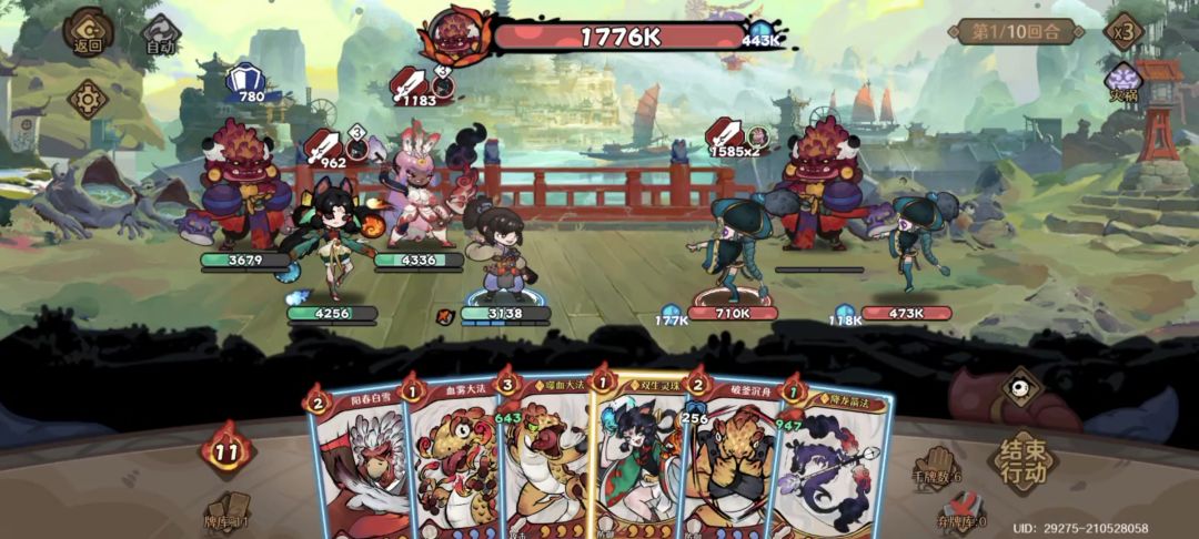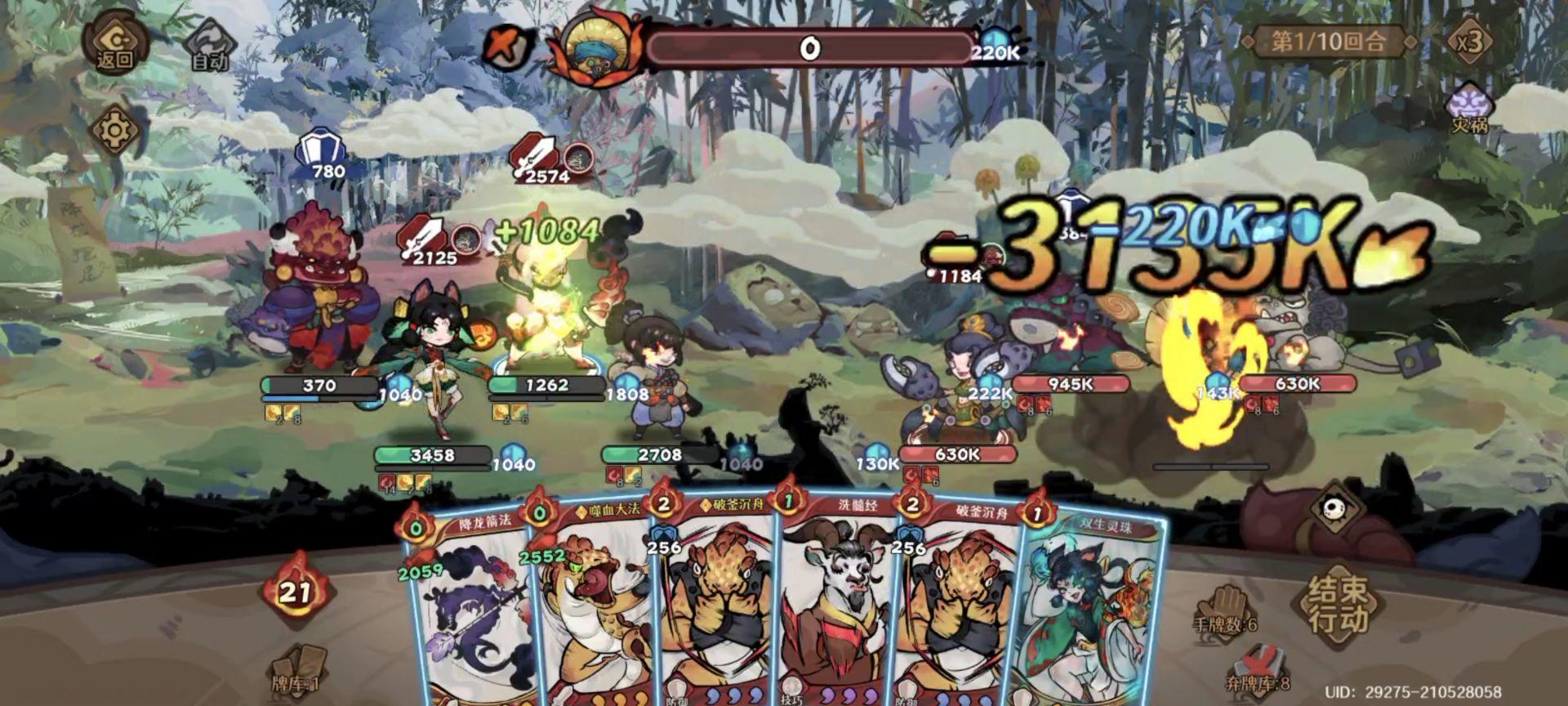 1.优先过牌触发天山灵童真气技,破釜沉舟(嗜血大法也行,但是多1费)+赤焰决。中途可打出血雾大法、弯弓武学、弯弓大招、洗髓经等。