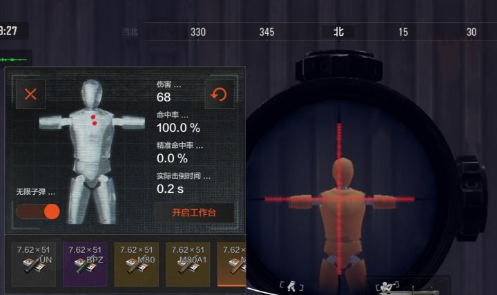 M110,是获得这个效果以后,能发挥到最好的,在满配的情况下,垂直后坐力能到90,水平后坐力能到97,第1张图,就是100米的靶,0.2秒两枪的效果。第3张图是用过脚架以后的。