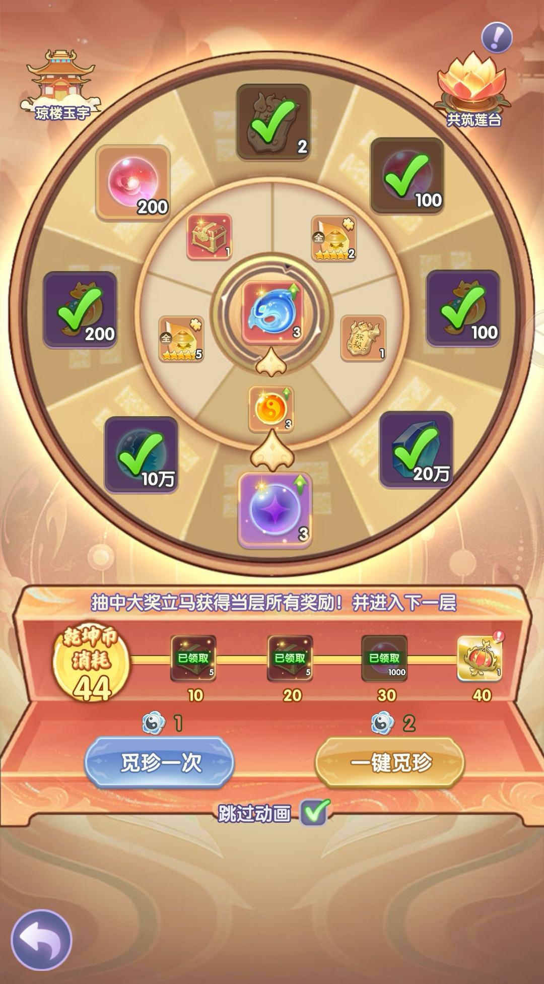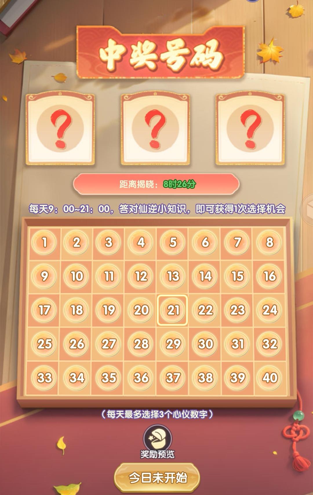5.竞猜中奖,每天答题获得选号次数,每天3次选择,中3个号码奖1888仙玉,中2个号码奖888仙玉,中1个号码奖200仙玉,不中奖100仙玉。少的可怜,奖励翻10倍才好。