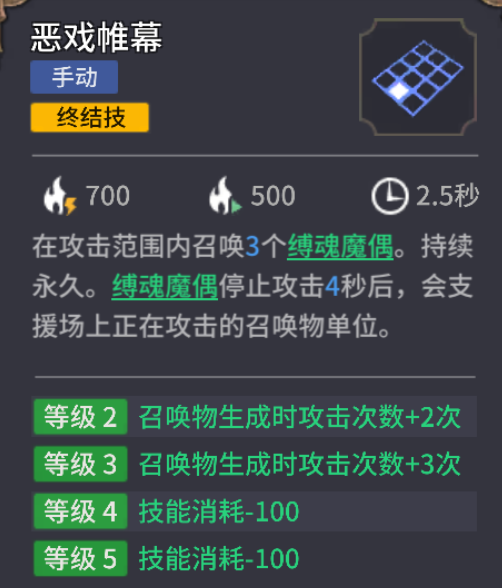 谢幕一击(叠加增伤):目标受到缚魂魔偶攻击,会持续增加受到缚魂魔偶的伤害,薇莉丝可拥有足额爆发。