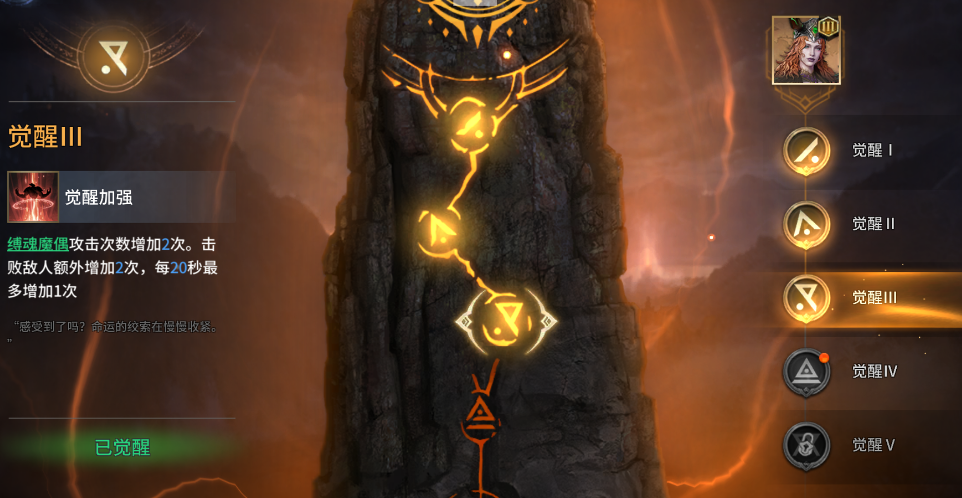 召唤3个缚魂魔偶,缚魂魔偶会自动索敌,每个召唤物可攻击15次、每次60%伤害,可以在短时间内打出高额群体伤害。如果周围没有敌人(停止攻击4秒),缚魂魔偶会支援场上其他召唤物,可以跟着碧翠丝召唤物满地图跑。在攻击15次后会缚魂魔偶虚弱会移动到埃萨雷斯位置,埃萨雷斯开吞世者直接开吃,就能持续输出(如果没一直喂友方召唤物,埃萨雷斯输出容易断档)。