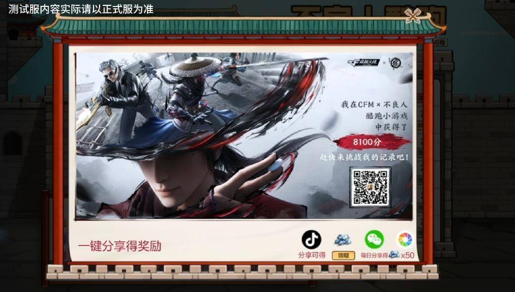 游戏结束之后还可以将自己的游戏记录进行分享噢!每周分享之后还可获得50钻石奖励,大家也可以分享给身边的CFM朋友,邀请大家一起来玩不良人酷跑活动!最终也可以比一比到底谁能跑得更远!谁的分数更高!
