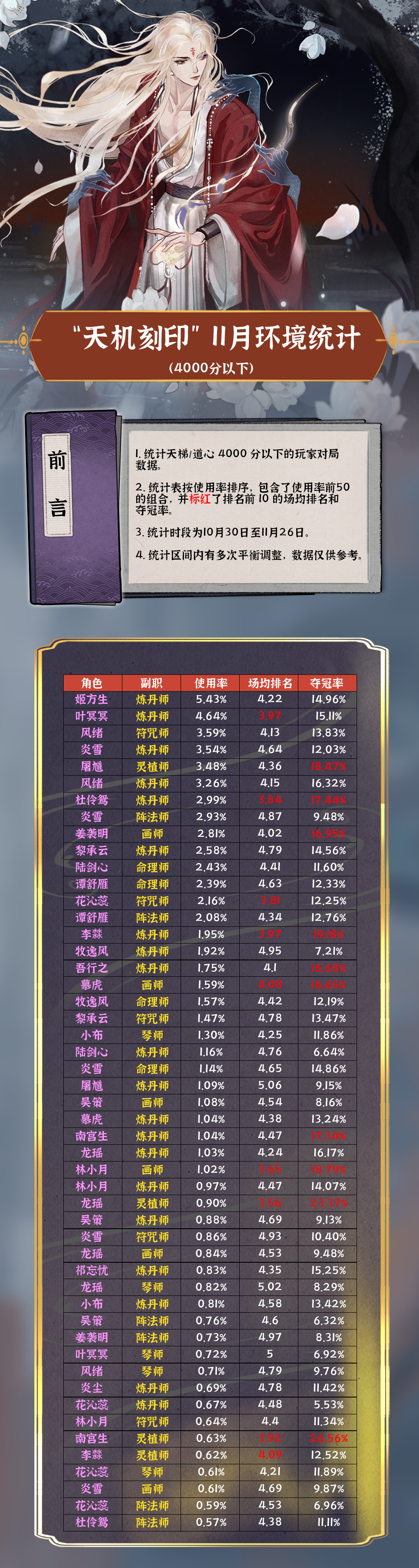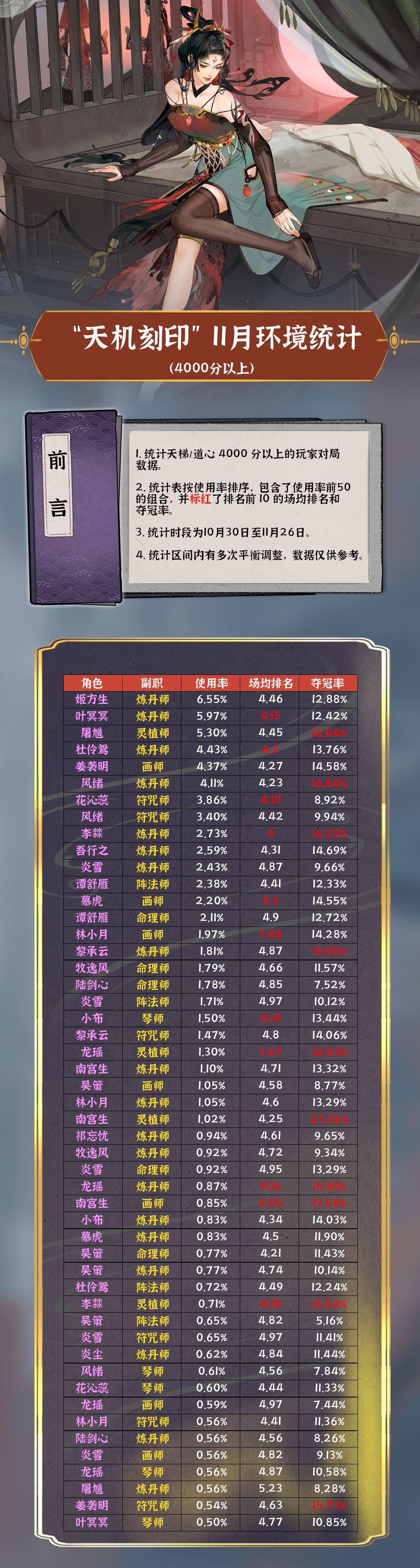 注:统计时段为10月30日至11月26日。因统计区间内有平衡调整,数据不代表当下的游戏环境。