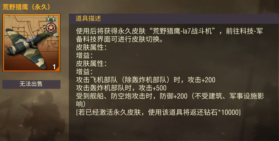 活动期间,钻石商城限时上架道具【la7涂装手册】。消耗【la7涂装手册】兑换【猎鹰礼盒】,开启【猎鹰礼盒】有机会获得永久皮肤【荒野猎鹰-la7战斗机】,100抽必得永久皮肤。