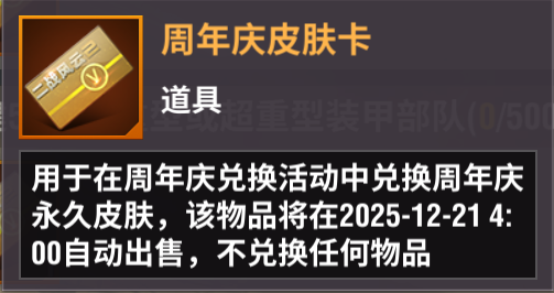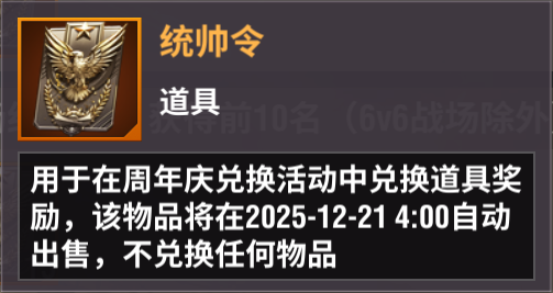 活动期间,收集道具【周年庆皮肤卡】、【统帅令】可兑换活动奖励。