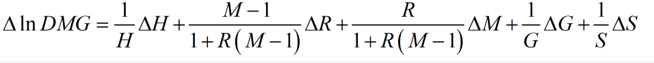 比较两个的偏导数,由于分母相同,就比较M-1和R的大小关系,考虑到△M和△R的取值范围问题,计算△lnDMG∝(M-1)△R+R△M