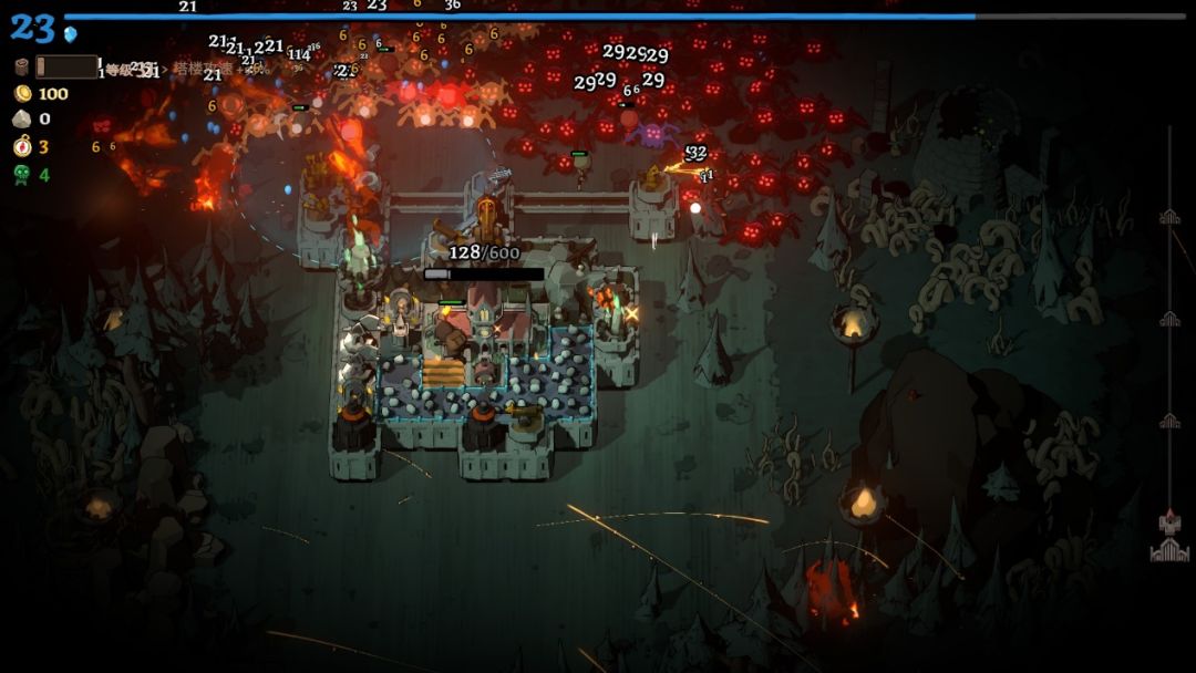 而到了战局光卡的后期,很难感受到肉鸽塔防带来的强度快感,而玩家操控角色输出量又非常低,更多只能作为辅助角色去减速,简单的清边都很困难,在第三第四轮的战斗中怪物如同潮水般四面八方涌入,这时玩家都非常难去吸经验升级,不升级那么基地的防御就会很弱,而且玩家角色死亡后会生成一个无法消除的墓碑,且无任何buff占用基地建造的位置。