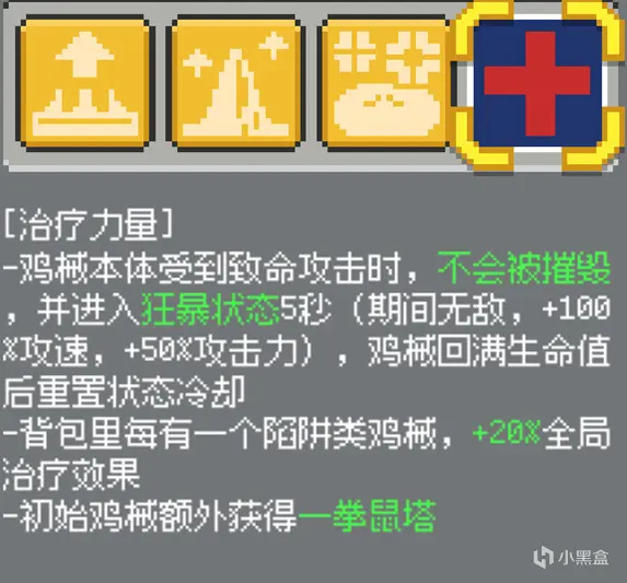 讨论:这个说是无敌,但是我体验下来好像其实是两个buff,第一血量无法掉到0以下,第二怪不会选择那个塔为目标,但是AOE可以造成伤害。比如火锅菇留下的毒液,仍然可以对我进入狂暴的鸡械持续造成伤害