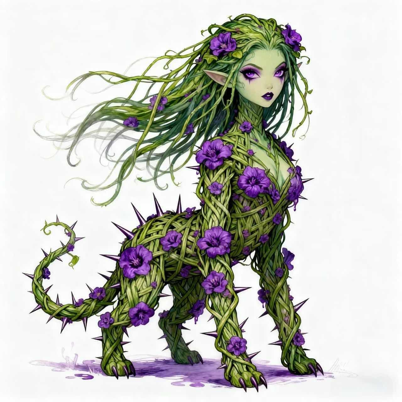 背景设定:外形像是一个由毒藤编织而成的人形生物,藤蔓之上布满艳丽的毒花和尖锐的毒刺,眼神妖媚且危险,仿佛能够看穿敌人的内心。