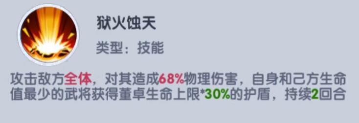 攻击敌方全体,对其造成68%物理伤害,自身和已方生命值最少的武将获得董卓生命上线*30%的护盾,持续2回合。
