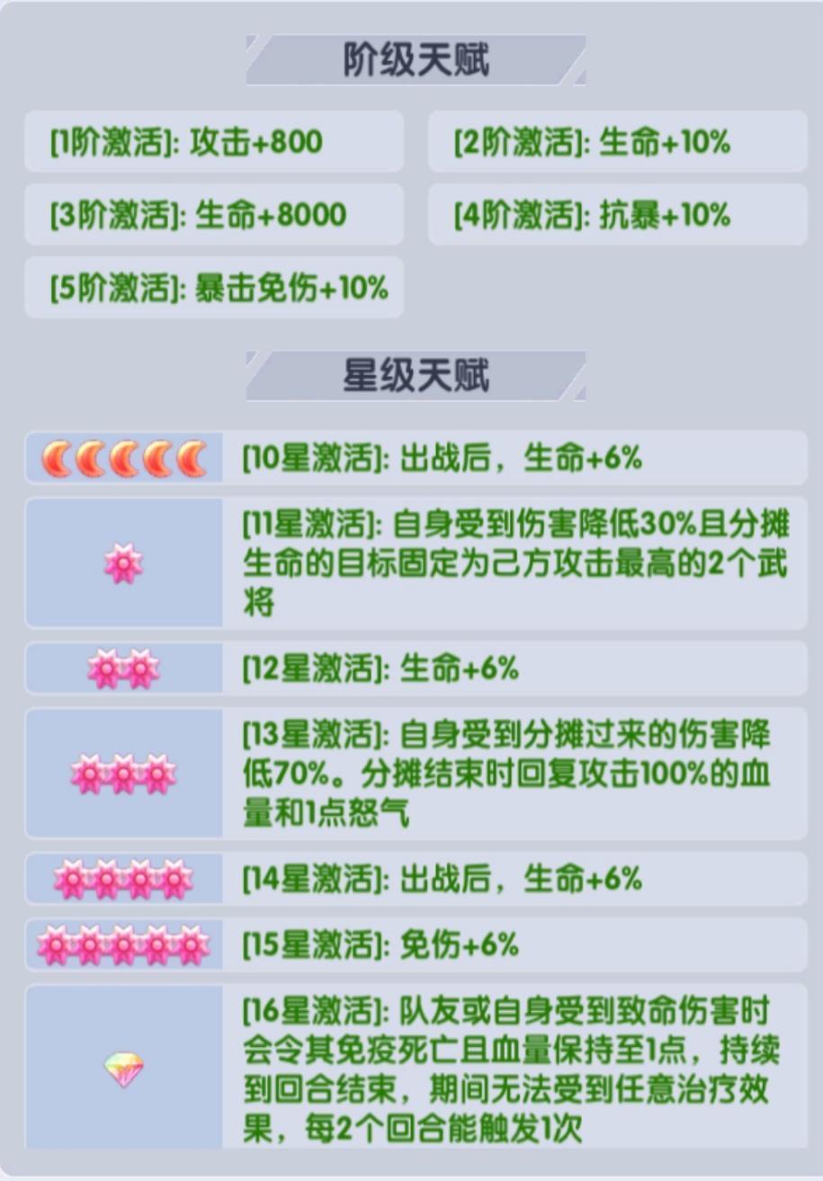 该效果搭配升阶后解锁的免伤属性,可有效承接敌方高额输出,16星解锁的专属免死机制为关键亮点,触发时可避免关键武将阵亡,在团战血线危急阶段为团队保留翻盘可能。