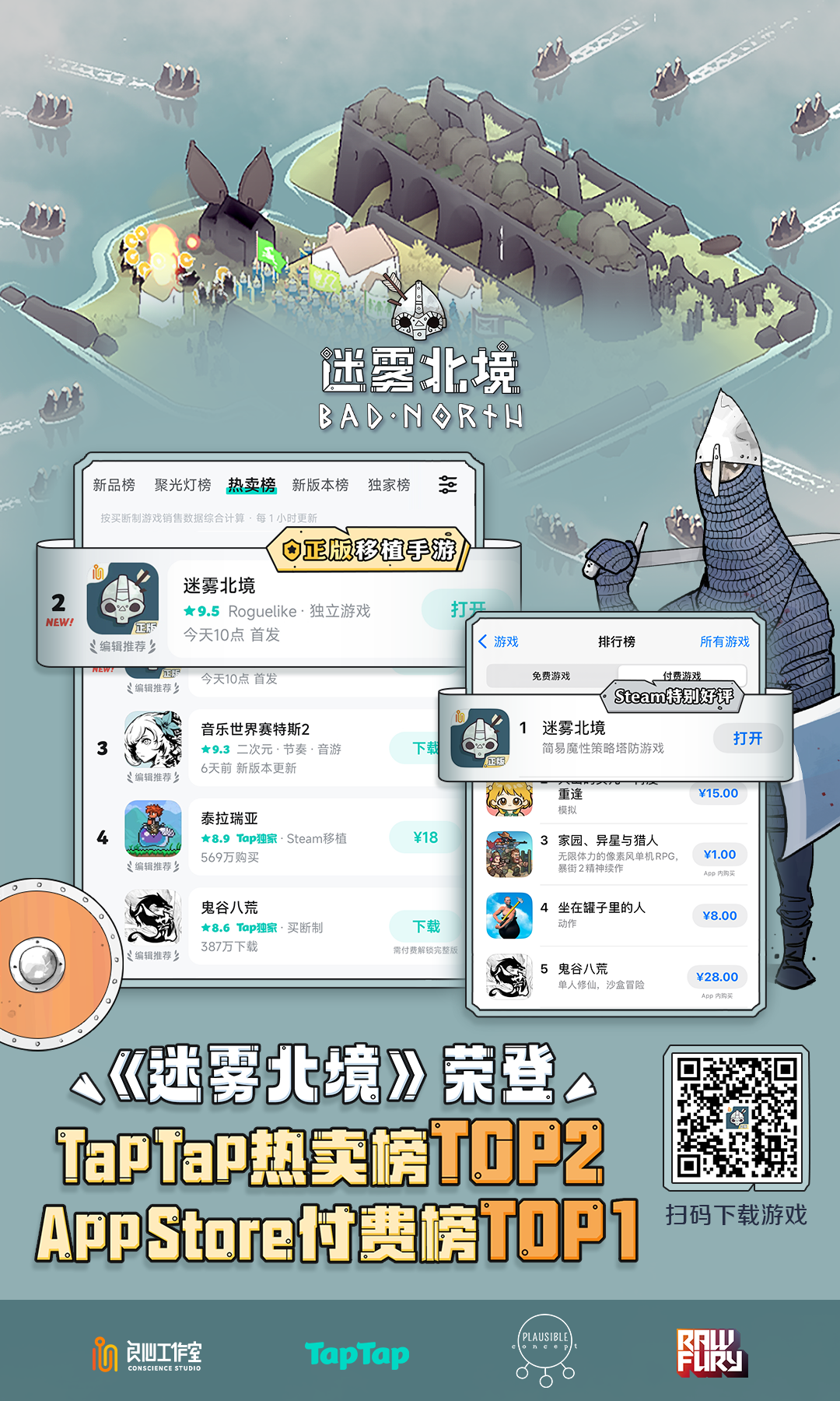 不知道大家的守护北境家园之旅还顺利嘛~良心哥非常开心地为大家带来一个喜讯!《迷雾北境》正版移植手游登上了 “App Store付费游戏榜第1”同时也获得了“TapTap热卖榜第2”的好成绩~