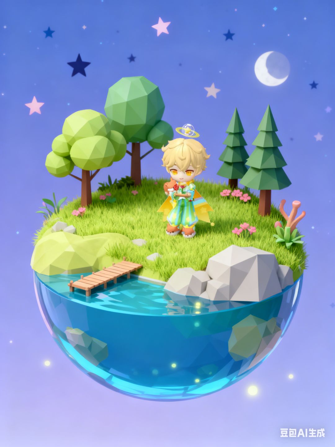 - 帮我生成图片:生成一张Q 版低多边形 3D 卡通风格微缩星球,半球面构图展示陆地与澄澈水域,【表面覆盖起伏的嫩绿色草地,搭配浅灰色块状岩石;植被为卡通圆冠树 + 针叶树,点缀粉色小型花草与奇异造型植物,加入微缩木栈道装饰,暗部添加萤火状弱发光点,参考图的人物和爱丽丝站在草坪上,向着镜头挥手致意;】整体色调柔和清新(马卡龙色系),低面建模质感,背景为背景是低饱和蓝紫色星空,散布星星、月亮,色调统一,星星有深浅变化,氛围童话治愈且富有故事感