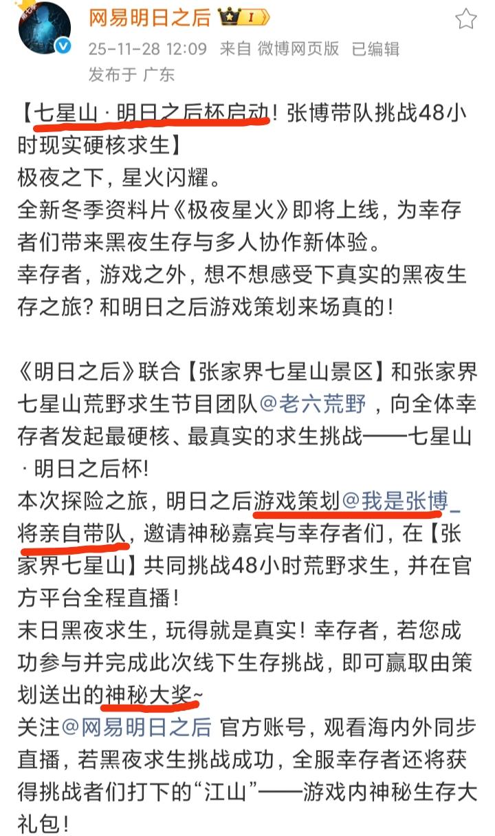11月28号,网易《明日之后》发文,他们搞了一个七星山荒野求生挑战!游戏策划亲自带队,同时也邀请玩家参与🔥🔥🔥