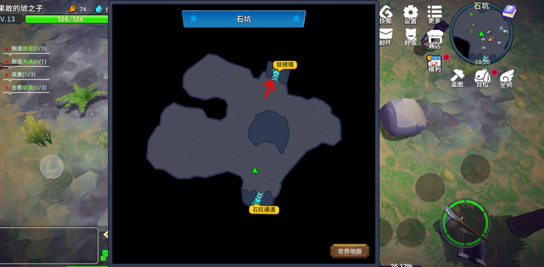 14.有了星石的加成我们的战斗力更强了。现在我们要向铁锈镇进发,可以看一下溪谷村的地图,往左下走就是石坑通道,穿过石坑通道可以到达石坑,这里产出大量的石矿和铁矿资源。通过石坑往上走就来到了铁锈镇。