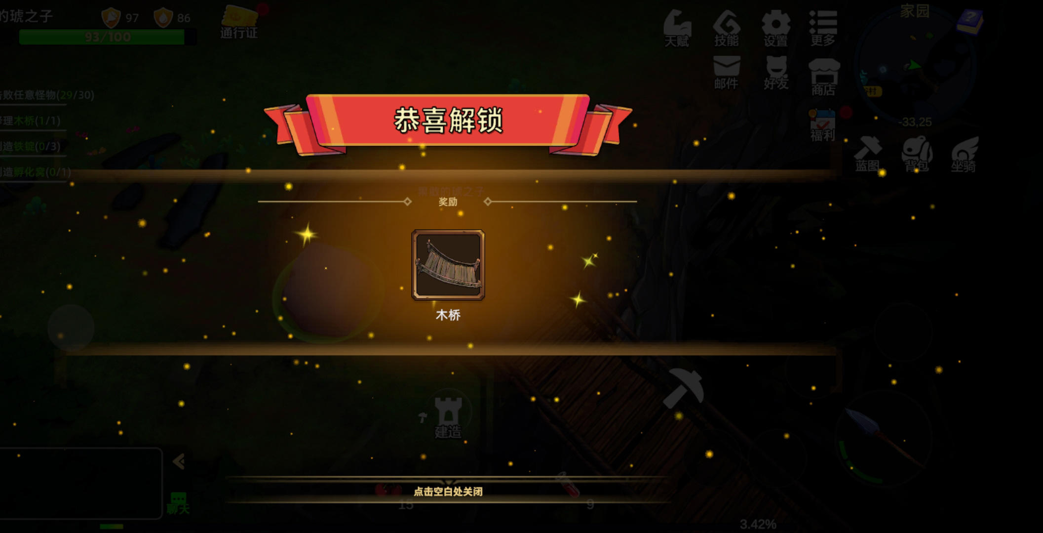 6。家园有很多散落的资源,建议大家把家里的资源全部采集存放后再出去外面的地图采集。在家园的右下角有一个断桥,我们上去查看一下,发现修理断桥需要十块木板。使用木工台加工就可以了