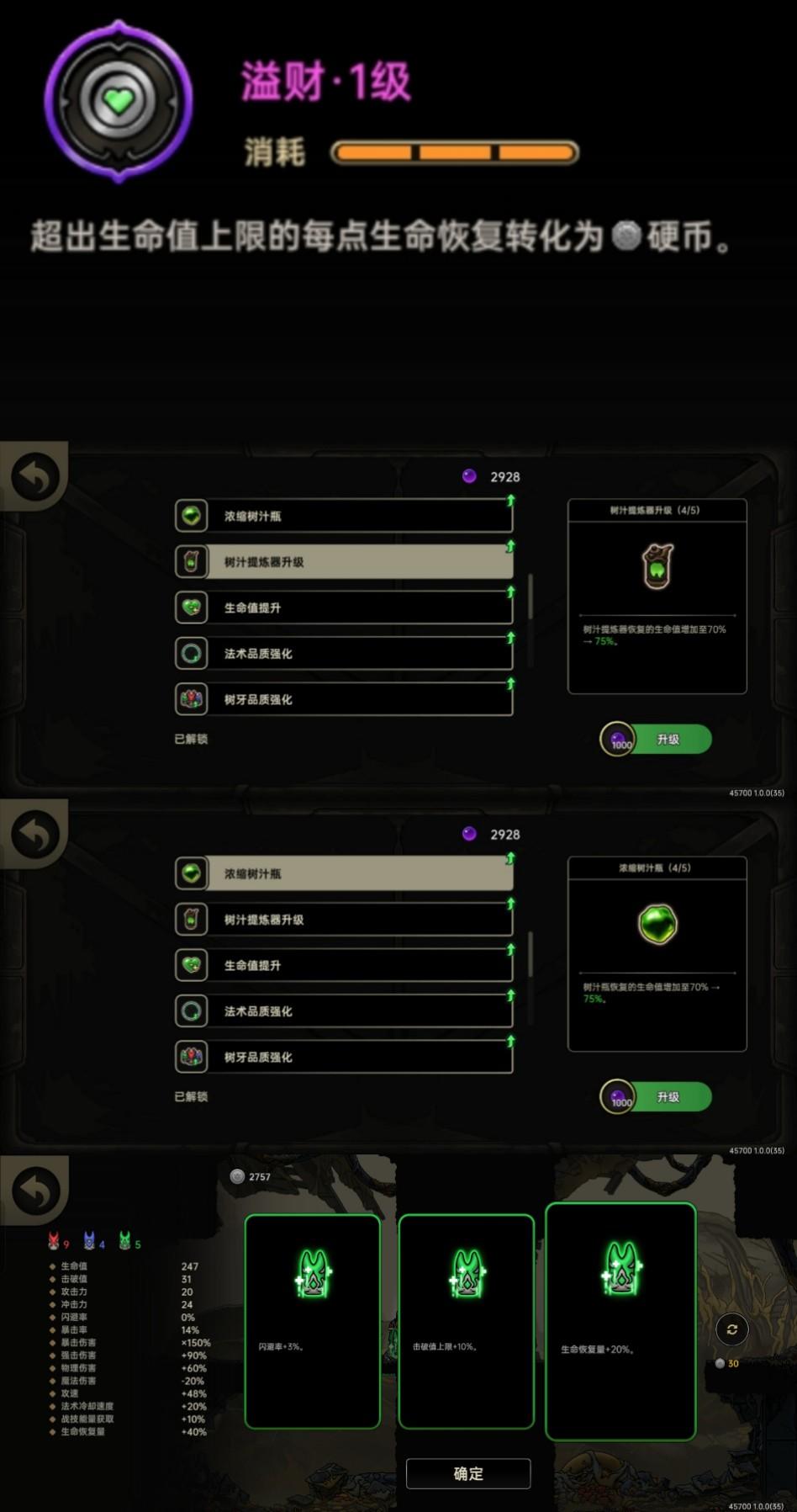 3.最大一次性给的钱没错经济最大来源,先把树汁的恢复量升上去,到时候溢出的血就会转换成金币,绿树牙也有恢复血量百分比,收益大大!