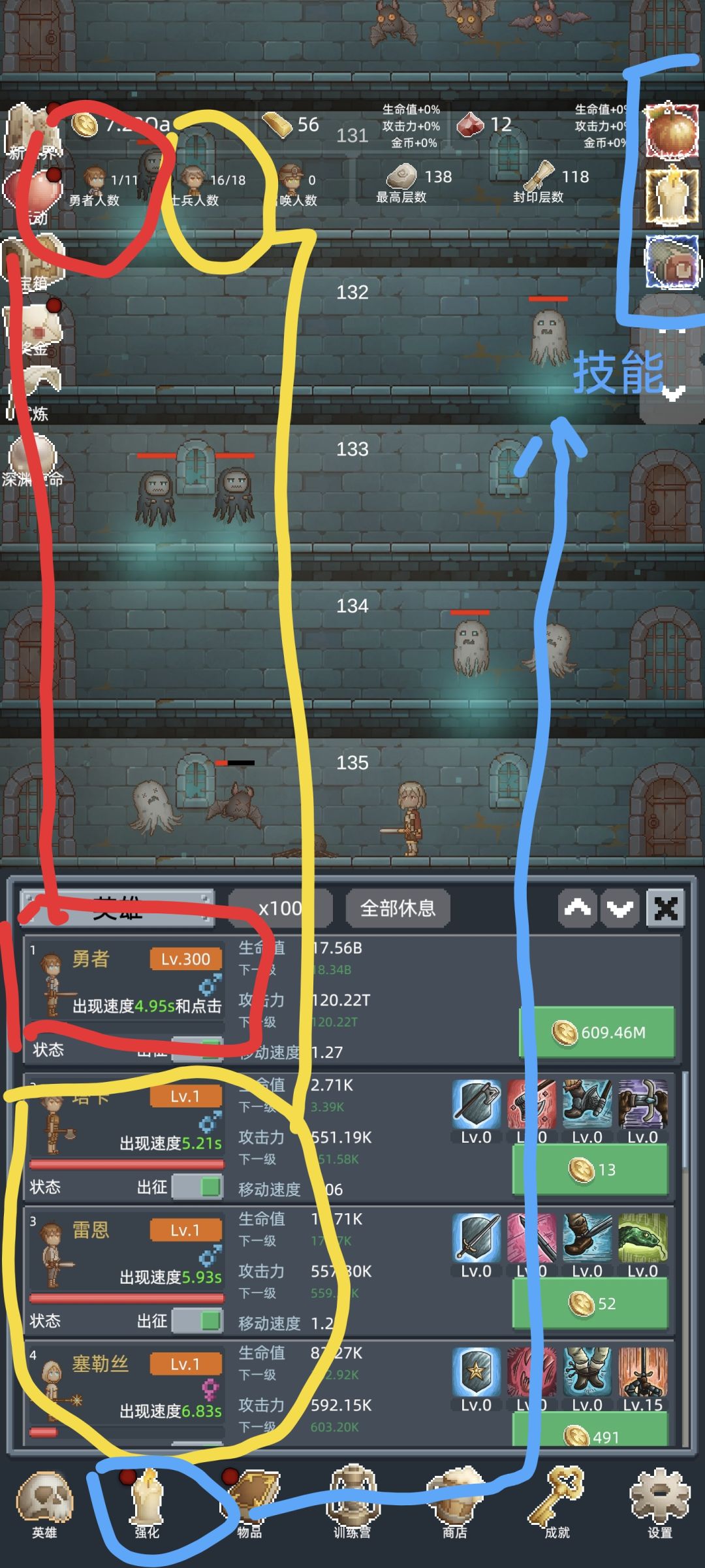 ①勇者:主人公游戏主要操作,点击释放(点哪一层到哪一层,直击当前推图新层)