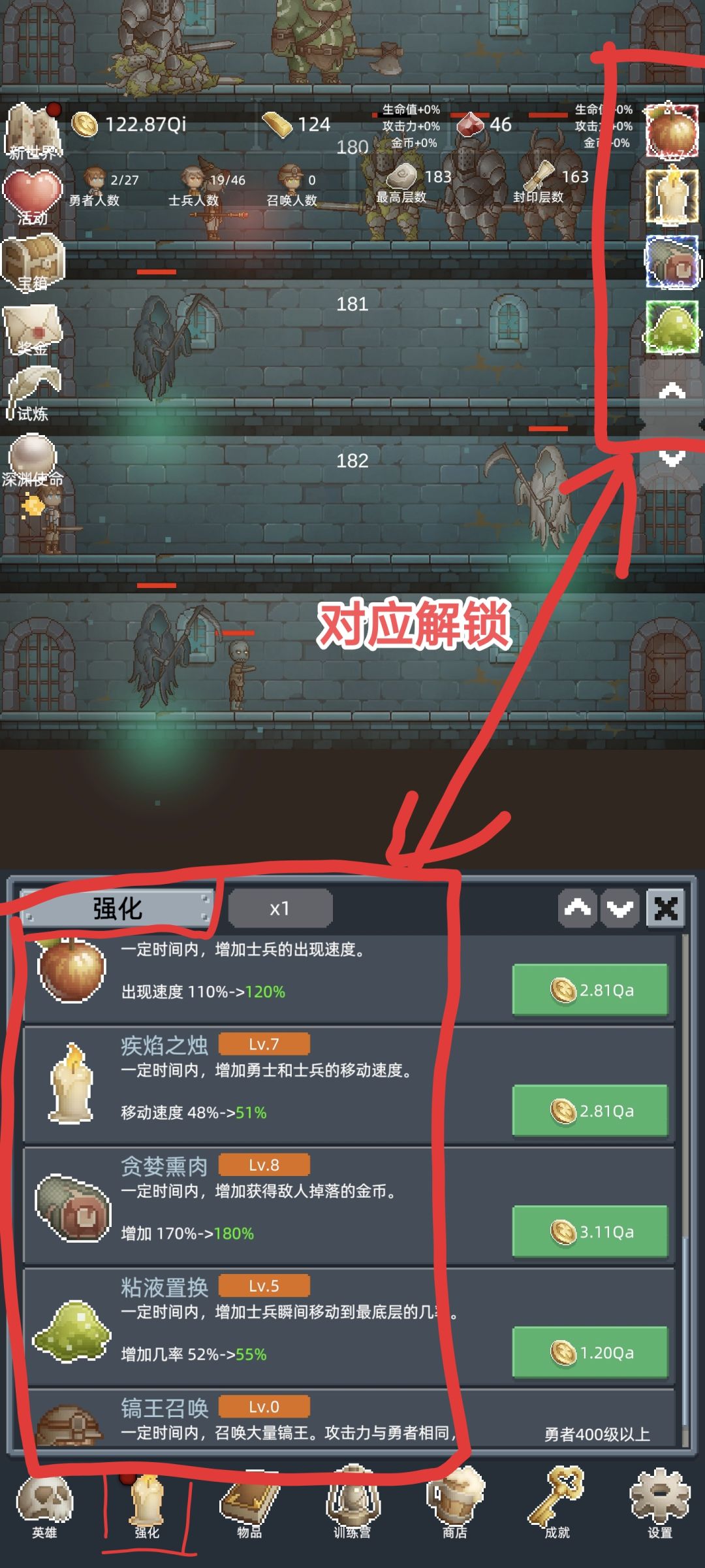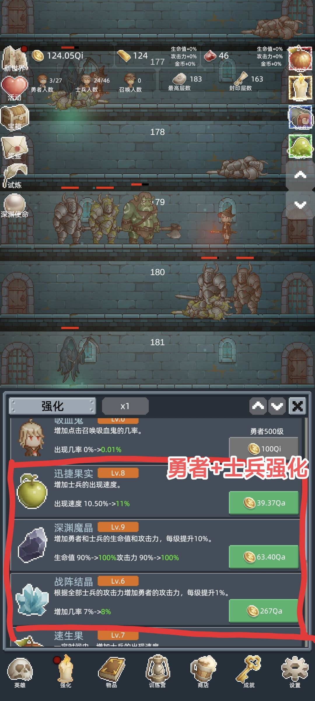 ①金币,英雄(士兵和勇者),强化属于局内,跟新开轮回从零开始,不用留着因为带不到下一局轮回
