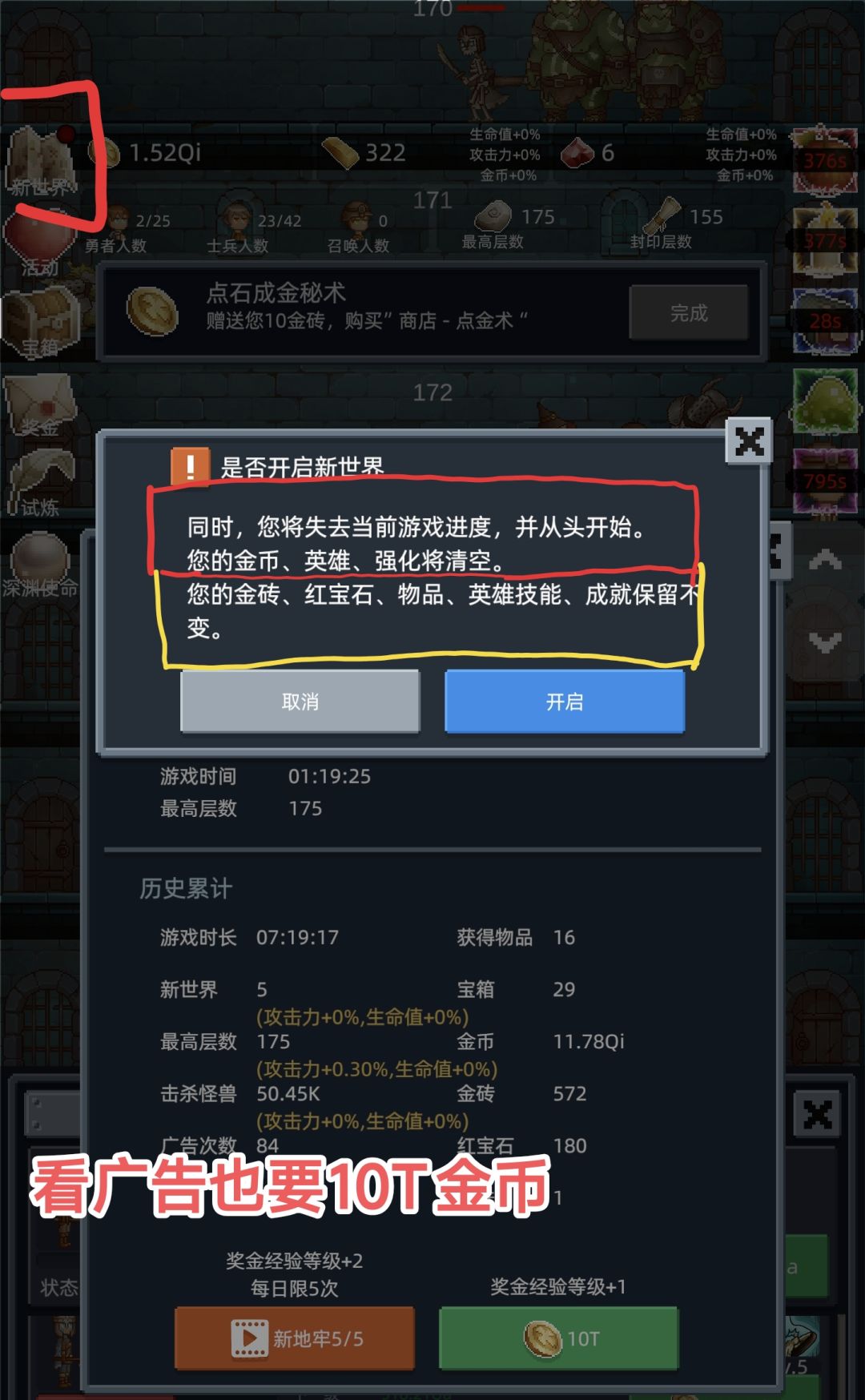 开启新世界需要 10T金币(广告也需要满足金币条件)
