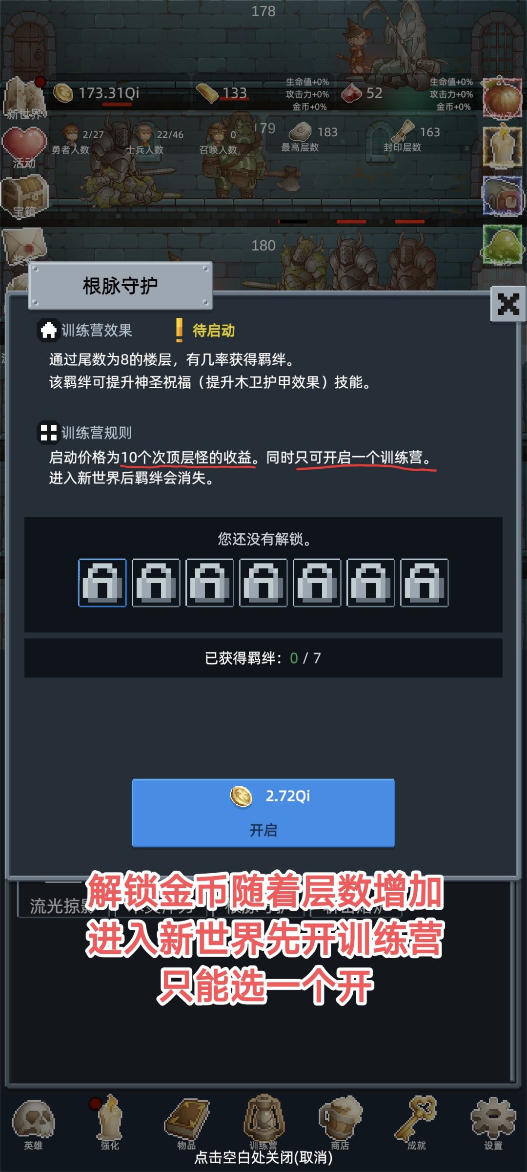 开启门槛随推层升高,重开可以先选好要开启的训练营,注意试炼时间(我选的第一个,女武神攻击)