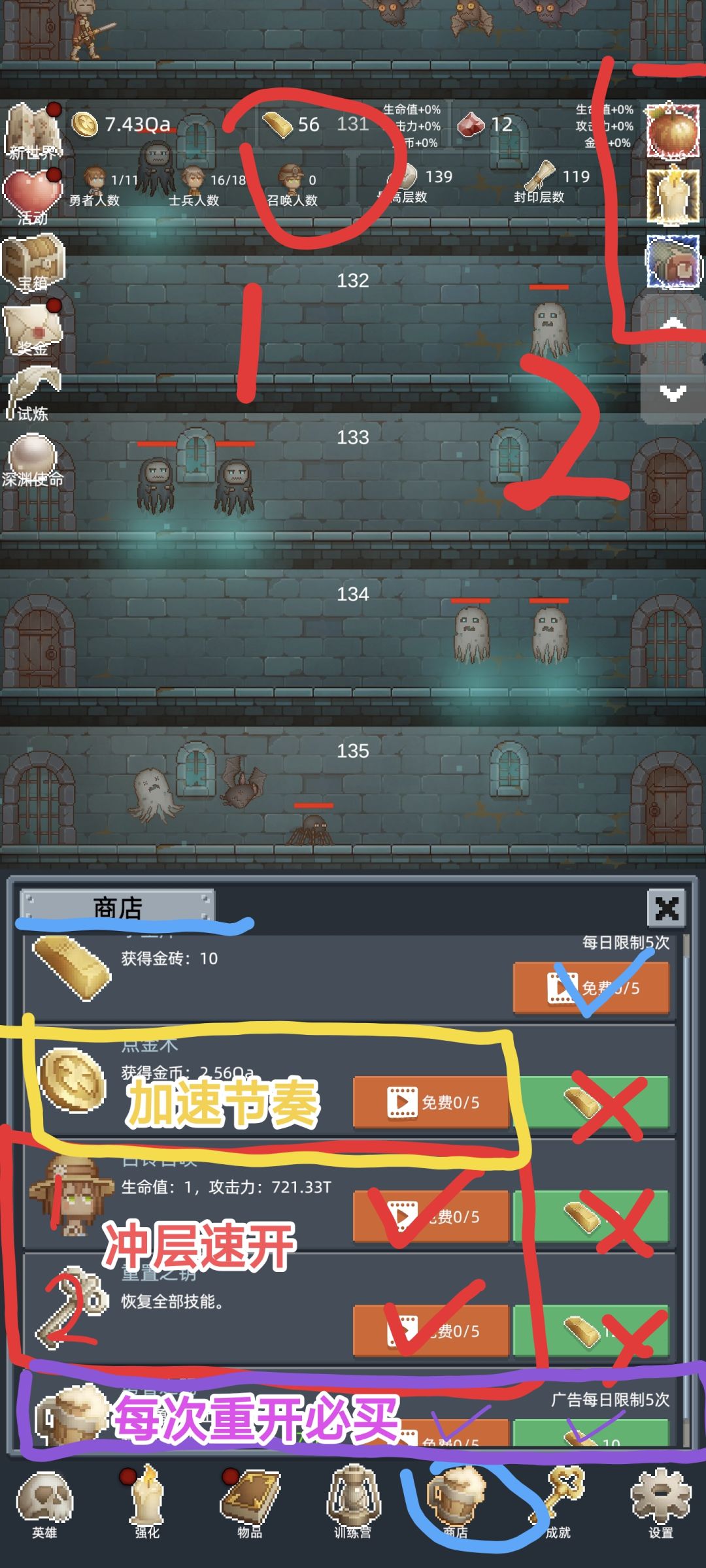 敲重点,所以每次轮回首要任务刷够10T金币,然后迅速进入下一层重复获得养成资源