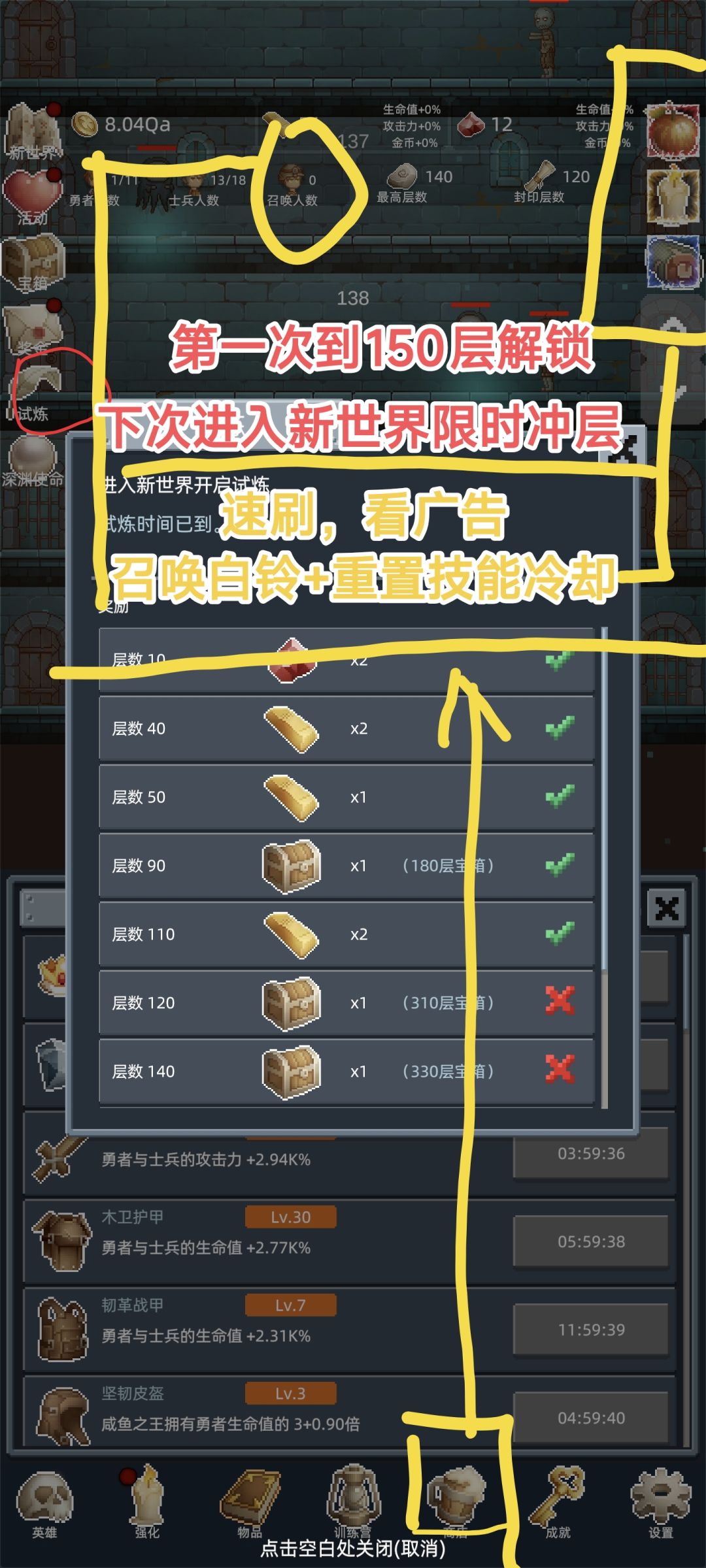 比如100层、120层、150层,但跨度有点大,刚开始到100层攒够金币就可以重开了,不用硬磨。注意宝箱节点,适时重开。