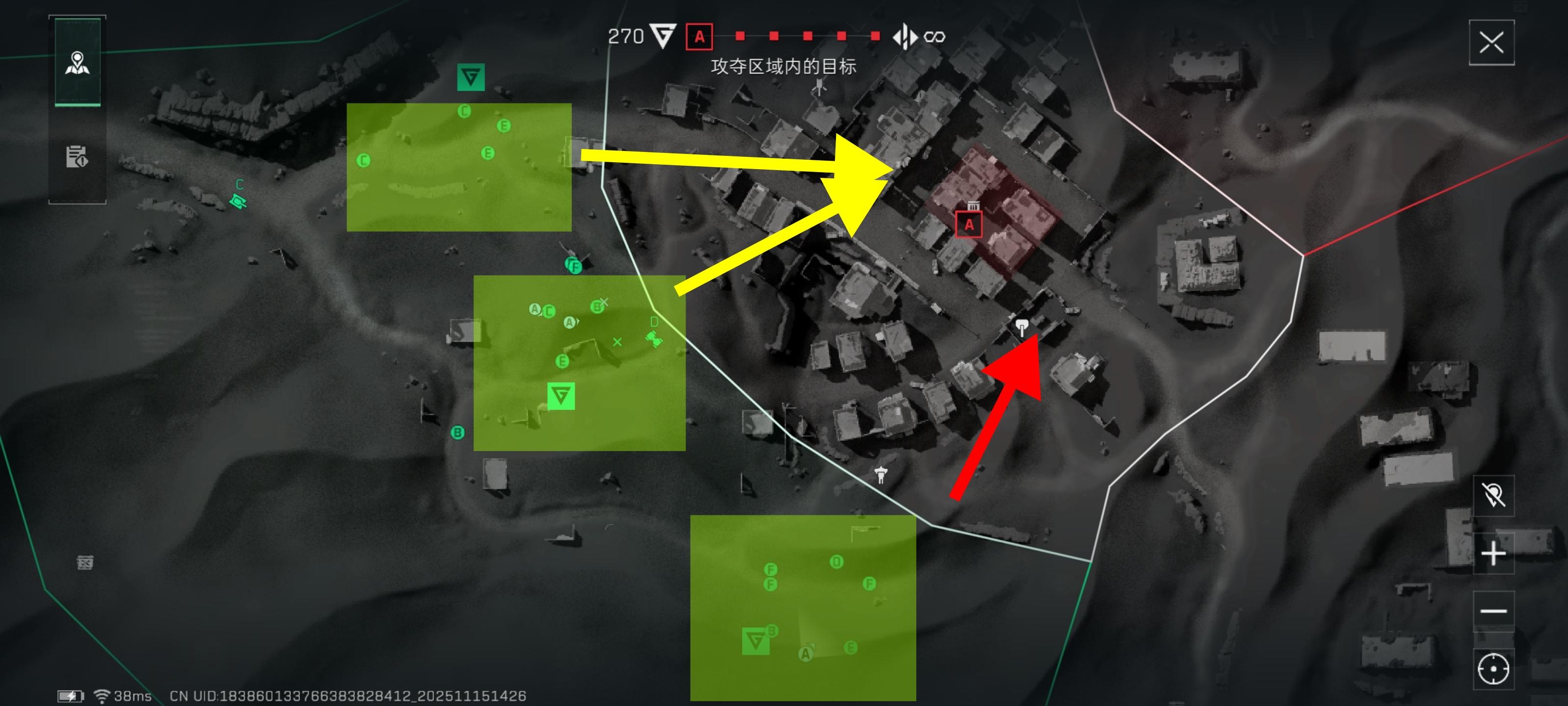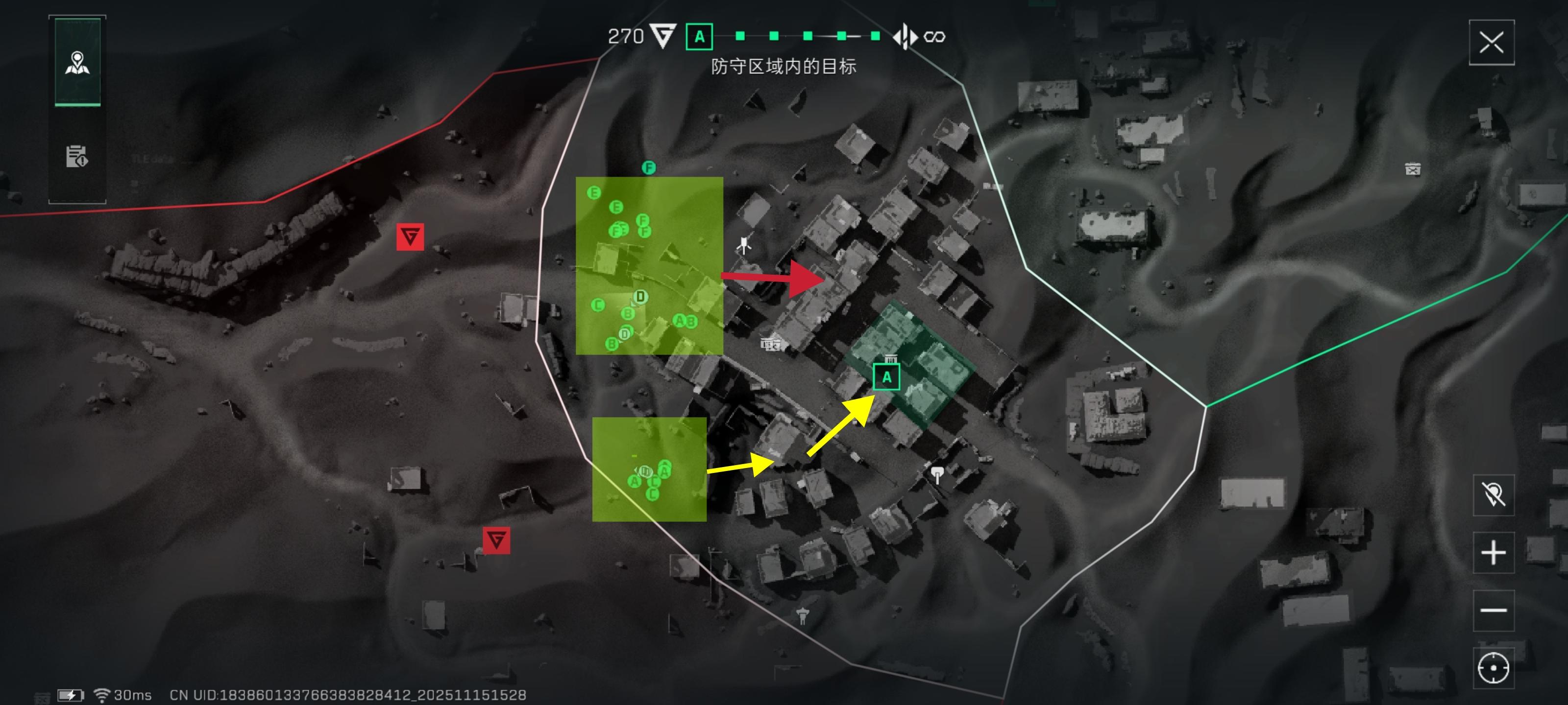 防守方与进攻方开局可以说是脸对脸见面就打的一个局面,只要防守方的枪线不密集很容易被攻防冲破。那么两个复活点的人可以利用开局的地形优势沿着黄色和红色剪头进入建筑内,通过进行高打底进行压倒性的火力输出在搭配上工程兵的ADS和支援的弹药箱可以进行几乎性质的输出。同时在A点也必须有人占领周围的房子以防对面打侧面进行速点。