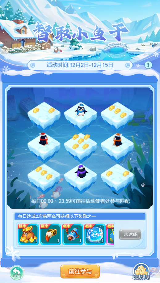 2、游戏持续若干回合,每回合玩家将有15秒的时间选择前往相邻的冰面,收集小鱼干