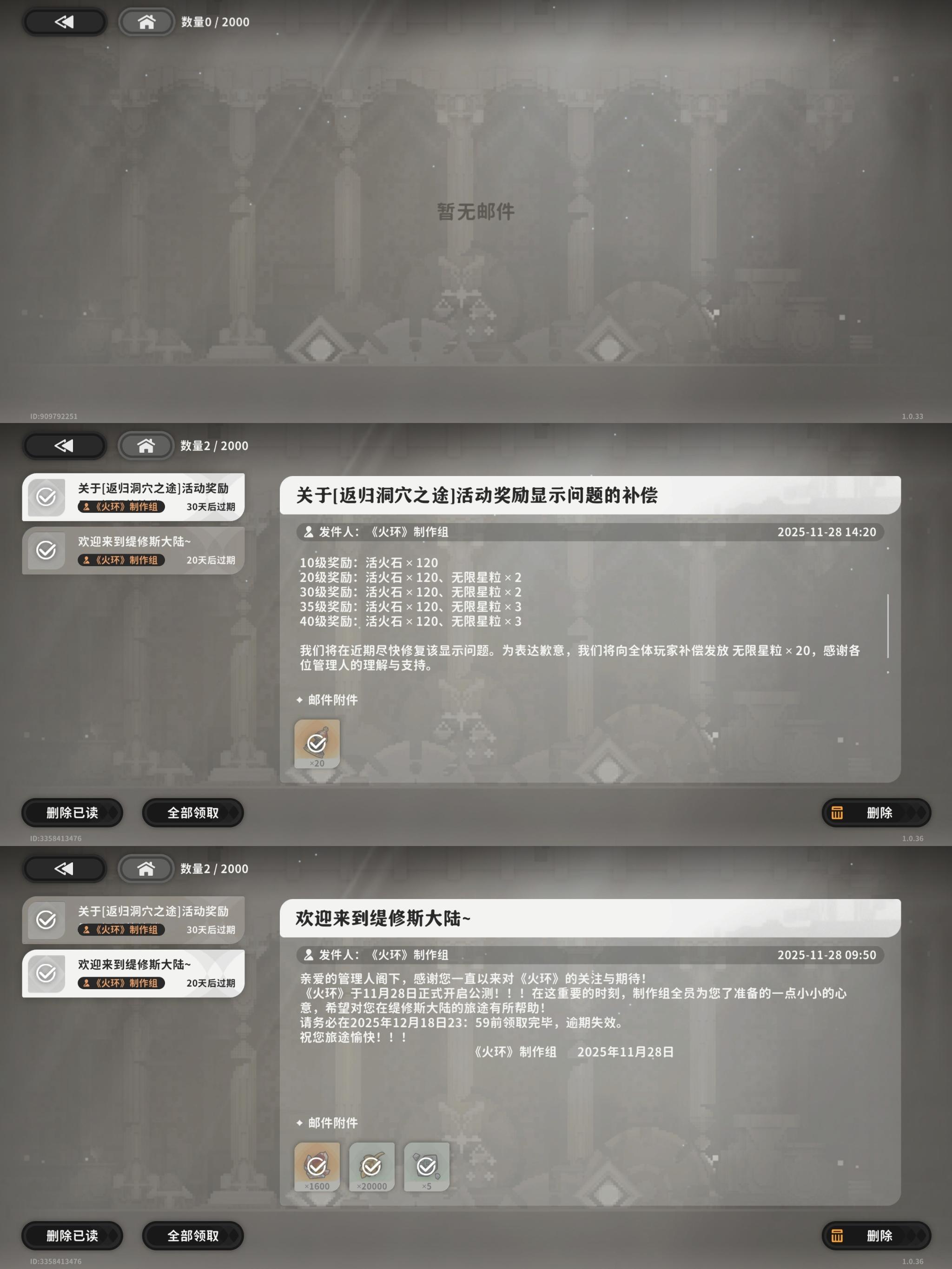 具体落实到开服福利上,很难想象究竟是什么样的神人运营能整出25年的游戏连预约里程碑奖励都没有的花活,邮箱里更是仅有10抽限定(1600活火石),20抽常驻(并不是福利而是活动奖励显示问题的补偿),七日签到奖励也仅仅只有没有诚意的常驻十抽加420活火石(约等于不到3抽),剩余的奖励就是等级奖励以及一些新手任务奖励等一次性奖励,甚至可以抠搜到你第一天把所有主线打完都抽不满常驻50抽的角色自选,这样的福利在某种程度上也是二游独一档的存在,真心可惜了美术组如此用心的美工了![[TapTap表情|TapFamilyxdoro2_粉狗发射]](https://img.tapimg.com/market/images/934f58613a089b2e214eb0e0638bbbad.gif)