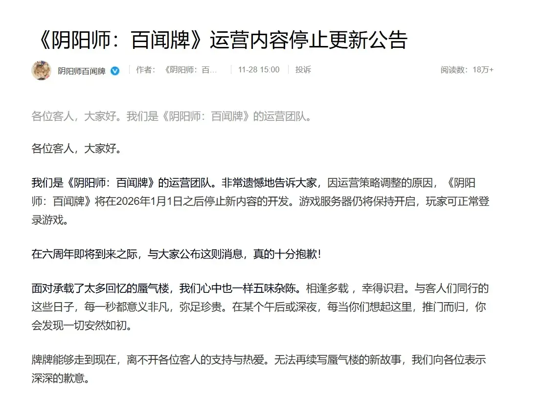近日,网易旗下基于《阴阳师》IP开发的卡牌对战游戏《阴阳师:百闻牌》,于11月28日通过官方渠道发布公告,正式宣布游戏将于2026年1月1日之后停止新内容的开发,这意味着这款自2019年12月12日上线,即将迎来六周年的游戏,将进入“停更不停服”的状态,官方承诺服务器会继续保持开启玩家仍可登录体验已有内容,并且暂无停止运营的计划,虽然百闻牌没有新内容更新了,但至少短期内服务器还在也算是善终了![[TapTap表情|TapFamilyxdoro2_粉狗比心]](https://img.tapimg.com/market/images/101c7e3200596fe8e03765080b467fb8.gif)