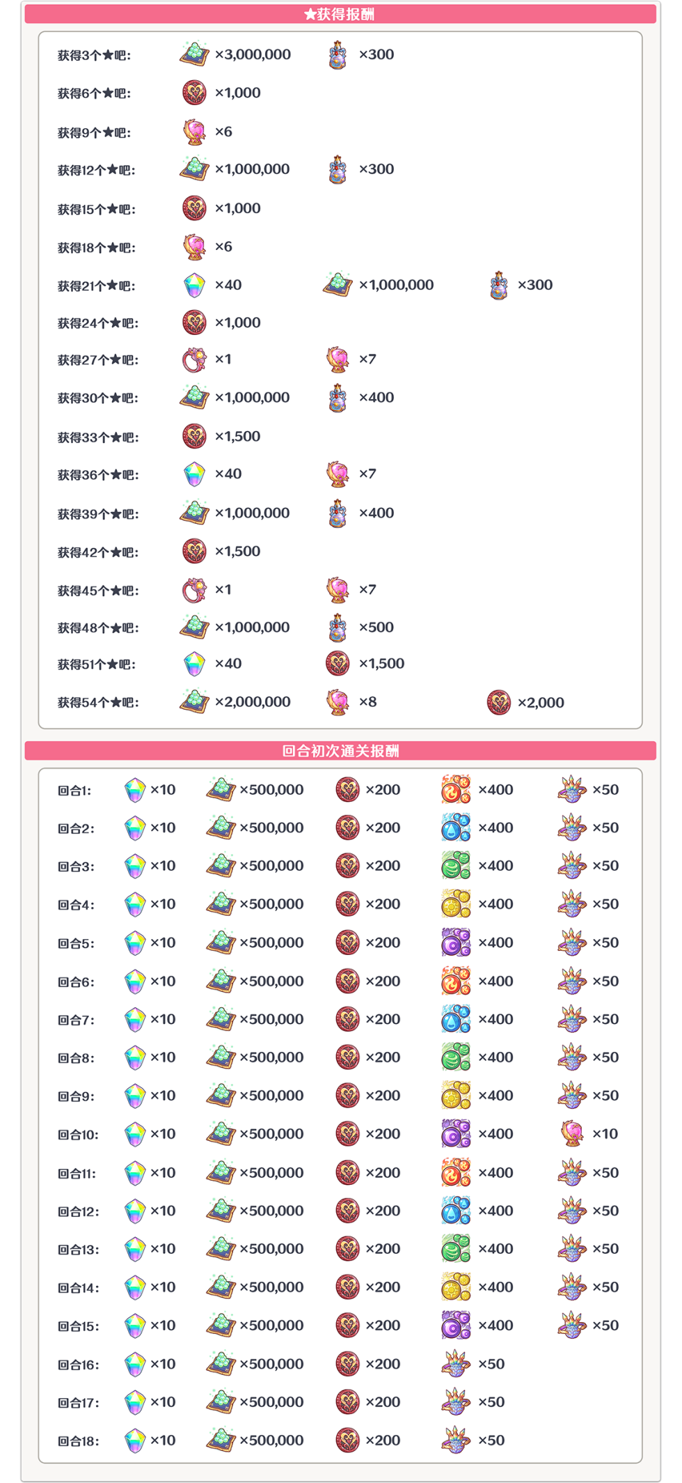 ・首次通关回合时可获得初次通关奖励。另外,若达成指定的挑战目标还可以获得★。累计一定数量的★后可以获得额外奖励。