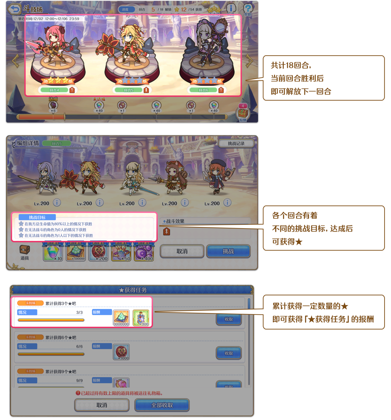斗技场改版后,首次通关每个回合时均可获得通关报酬。另外,通过完成挑战目标获得的★累计到一定数量后,还可以获得额外奖励。