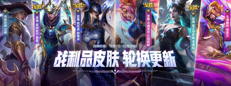 12月战利品皮肤轮换更新!12月1日-12月31日活动期间,至臻 青花瓷 丽桑卓、至臻 斗魂无双 艾瑞莉娅、至臻 星之守护者 辛德拉、至臻 星域秘刃 泰隆等多款皮肤轮换登场!届时,召唤师可使用相应的橙色原石兑换心仪皮肤~
