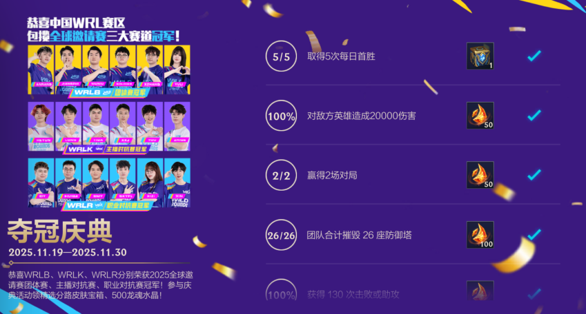 夺冠庆典来袭!截止至11月30日,召唤师完成活动任务,即可领取精选分路皮肤宝箱及龙魂水晶*500奖励~
