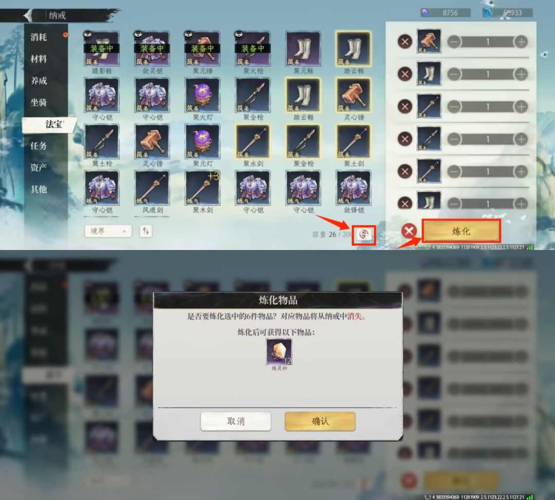 ②可以在【纳戒】中选择【法宝】界面,点击界面下方的【炼化】按钮,可以批量分解法器。