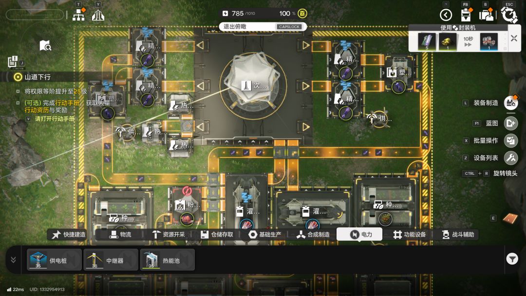 不断解锁科技树对于产能优化及提升有着非常重要的作用,甚至可以说只有到达了二阶科技,我们才有足够的能力(分流器、物流桥)去反复优化产线,产出的物品也会更有性价比、更加高级好用;不仅如此,前期在跑图解锁科技树的同时还要多多注意观察矿脉位置,及时设立野外矿脉发掘基地,没有足够的原材料,也就没有足够的成品产能。