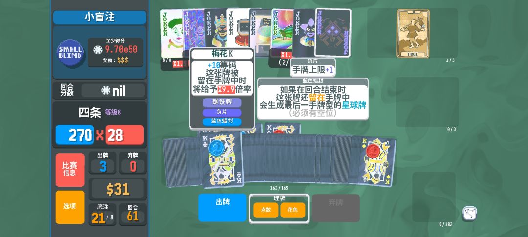 每一张钢铁牌K都在“哑剧演员”和“焊接工”这两张小丑牌的加成下来到了*9.9倍率,而在“哑剧演员”、“蓝图”和“男爵”这三张小丑牌的加成下,直接进行一个指数增长,再加上我这用“扎克”这样小丑牌复制的170张左右的负片钢K,直接就把计数器打爆了。