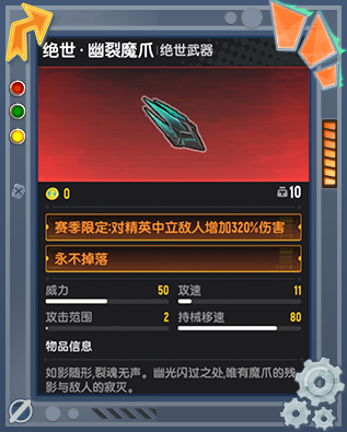 完成本赛季悬赏任务,肠肠还将获得全新绝世武器「绝世·幽裂魔爪」作为终极奖励!该武器拥有对精英中立敌人,增加320%伤害的赛季限定词条并且永不掉落,肠肠们一定不要错过!