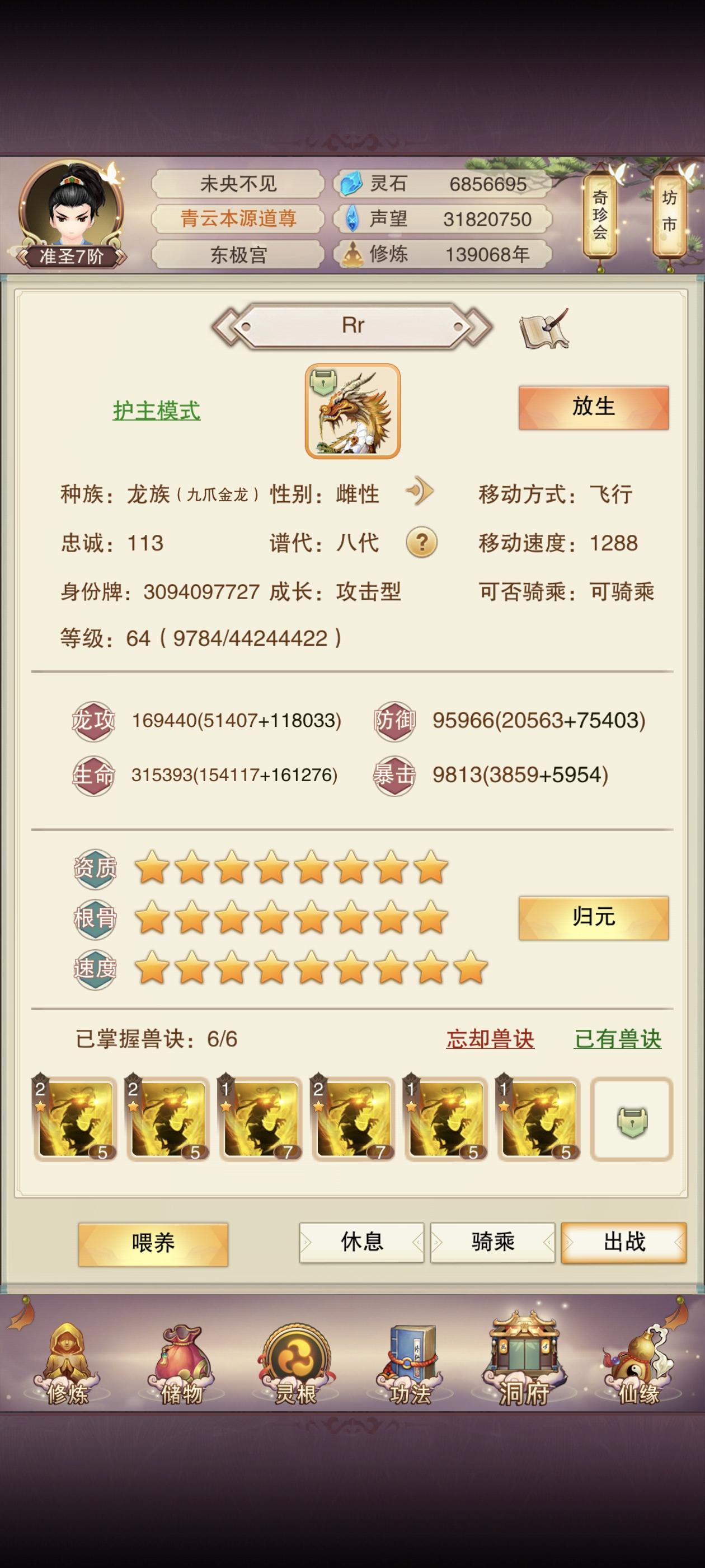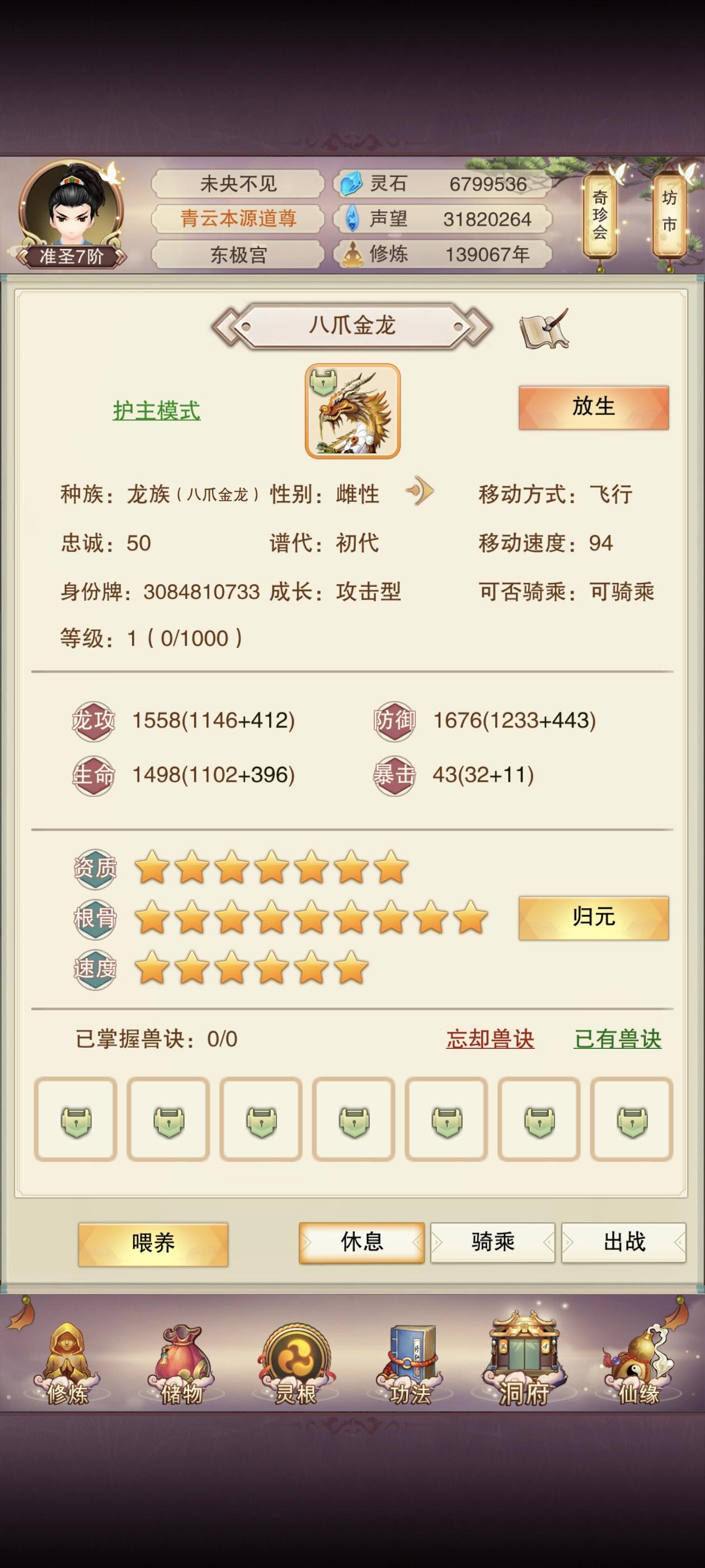 不知不觉菩提树采到神界果子了,万龙玺也祭炼一半进度了。前两天道场升完7级有了空余灵石开了几个高爪龙蛋,惊喜的开到了九星根骨,主宠已经有九星速度了,爪数也是早早弄到了九爪,坐等准10快乐丹,999指日可待了!唯一头疼的是忘了提前开点胚子,细算了下,一个八代居然需要128个胚子得开4个月