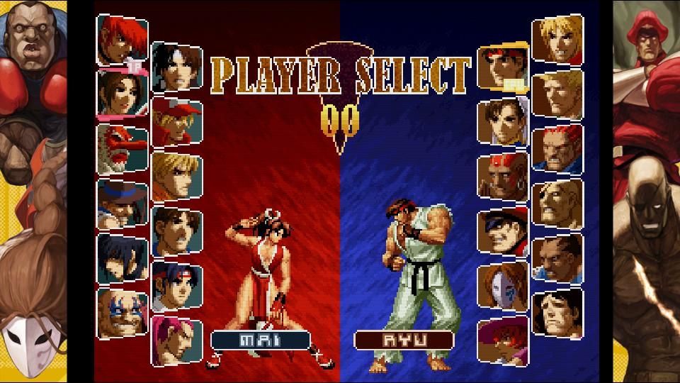 本作提供了大量可选角色,包括隐藏角色在内共计36名,有来自SNK系列作品中的不知火舞、八神庵、天狗、雅典娜、吉斯、特瑞等,也有来自CAPCOM系列作品中的古烈、隆、肯、丹、将军等。除了熟悉的《拳皇》、《饿狼传说》、《街头霸王》、《侍魂》等游戏,还有很多角色,比如《洛克人》里的ZERO、《合金弹头》里的火星人、《魔界村》BOSS(RED ARREMER)、《恶魔战士》里的Demitri、《赤色大地》里的Tessa等。
