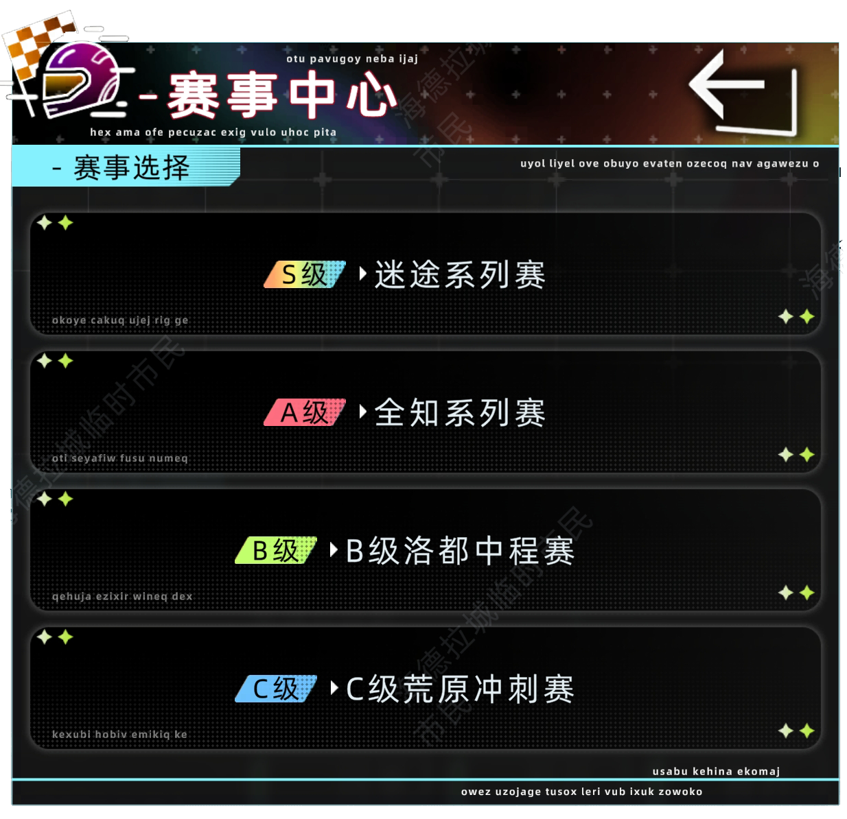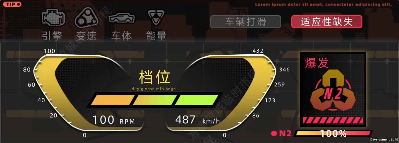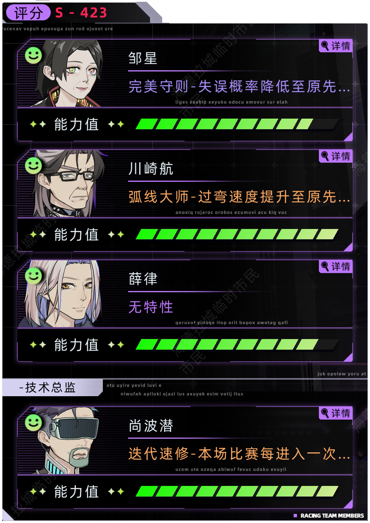 当车辆没有对应“路况适应性”时,驾驶会以大幅度损伤“车体套件耐久”,且额外损伤“引擎耐久”和“变速箱耐久”。各位驾驶员在比赛过程中的提示可以解赛道相关情况从而做出调整。