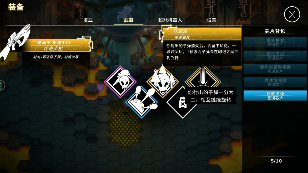 武器能够搭载5个芯片,塔亚能够通过在商店当中升级武器,从而增加芯片的槽位。