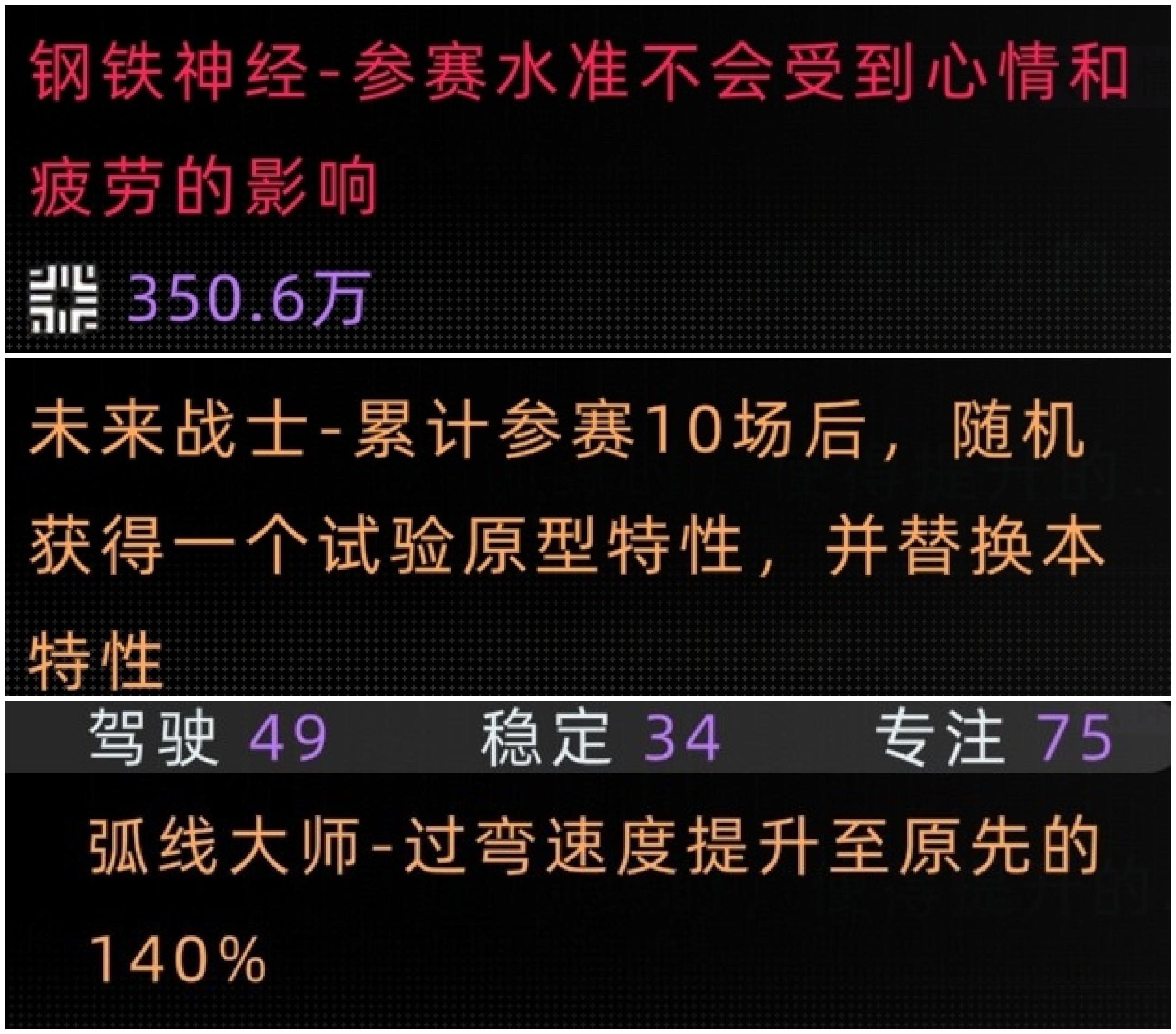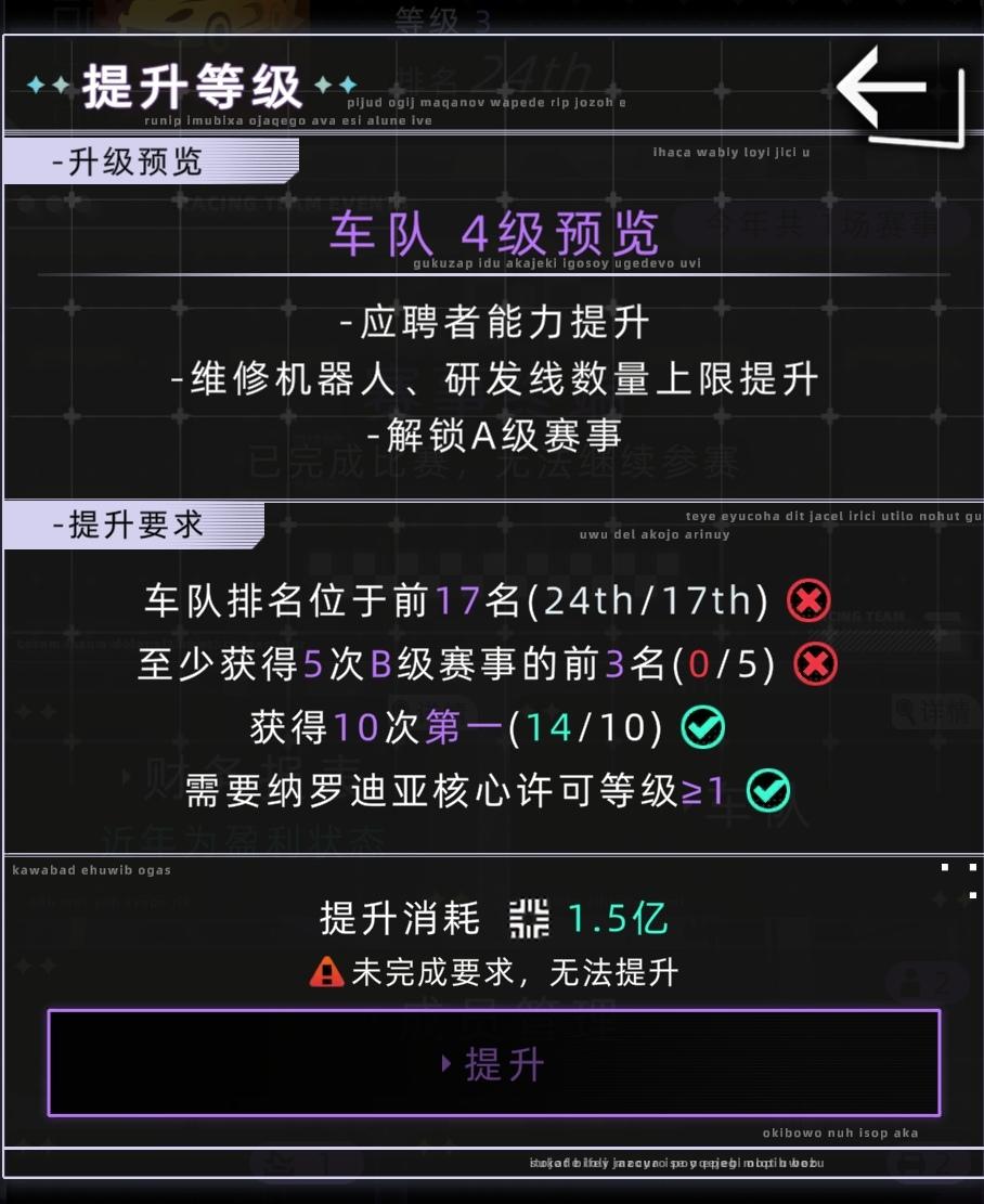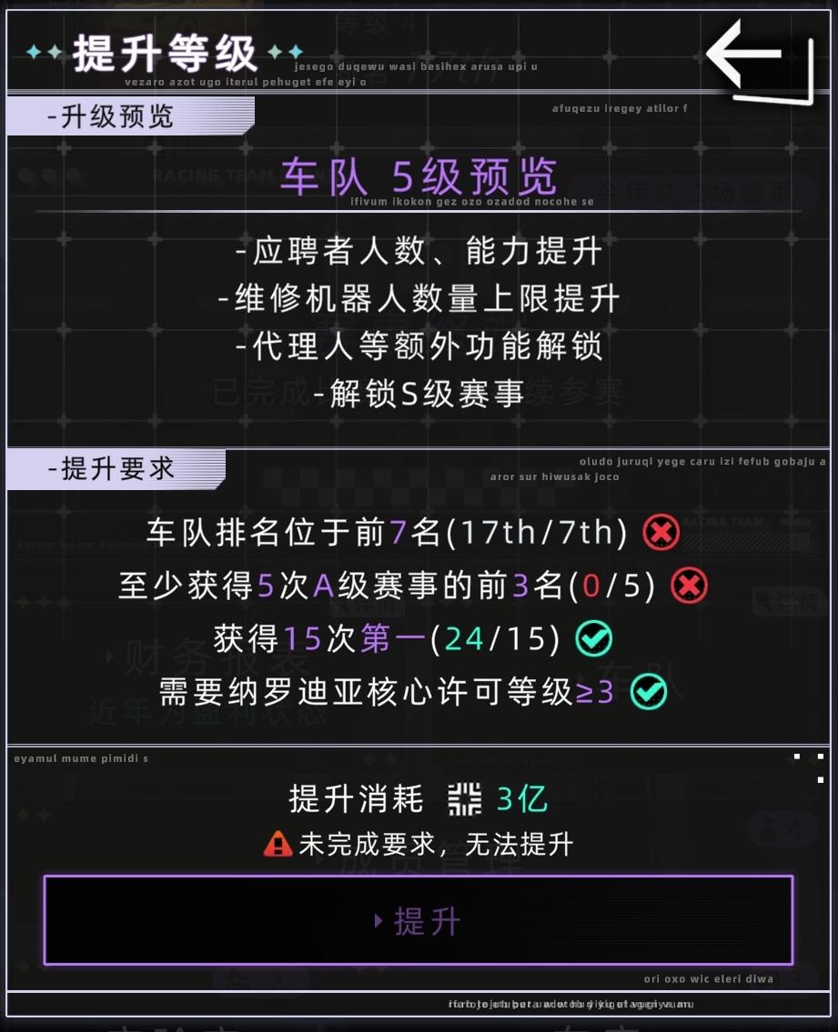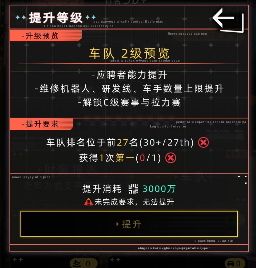 目前我唯一的永生角色瑶,进不了车队,所以车队是一个需要长久培育新的车手和技术总监的玩法,新出的男车手npc也进不了车队,简而言之所有特殊角色被车队排斥在外